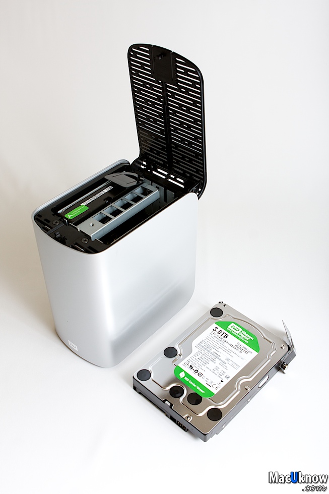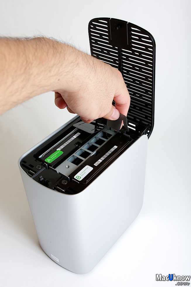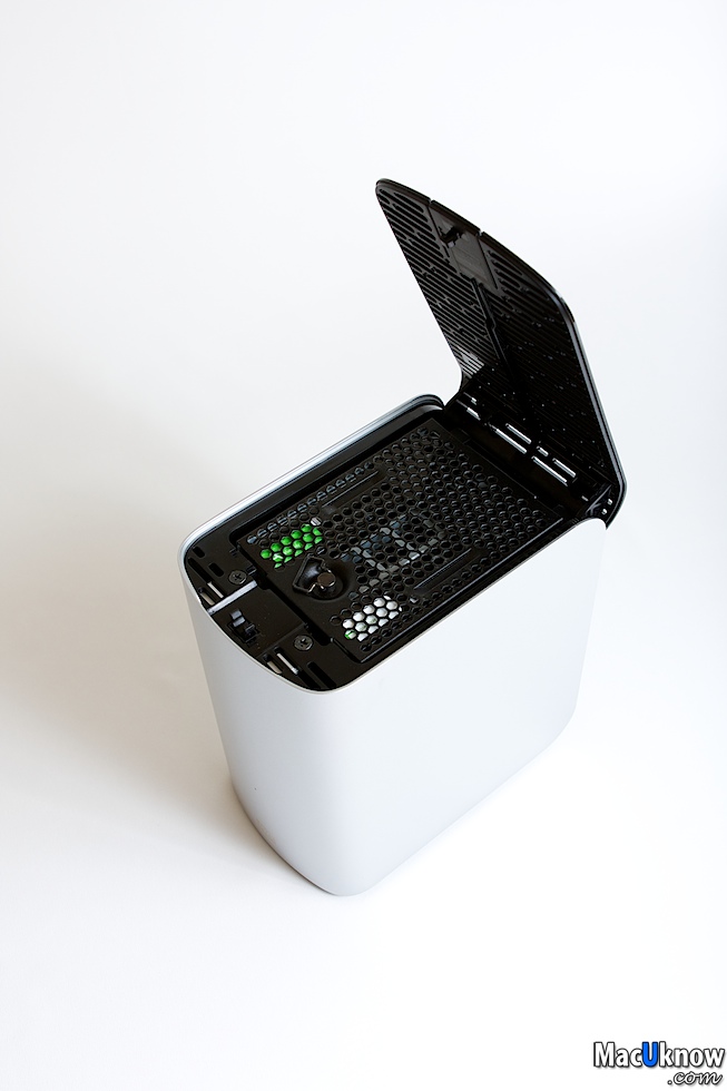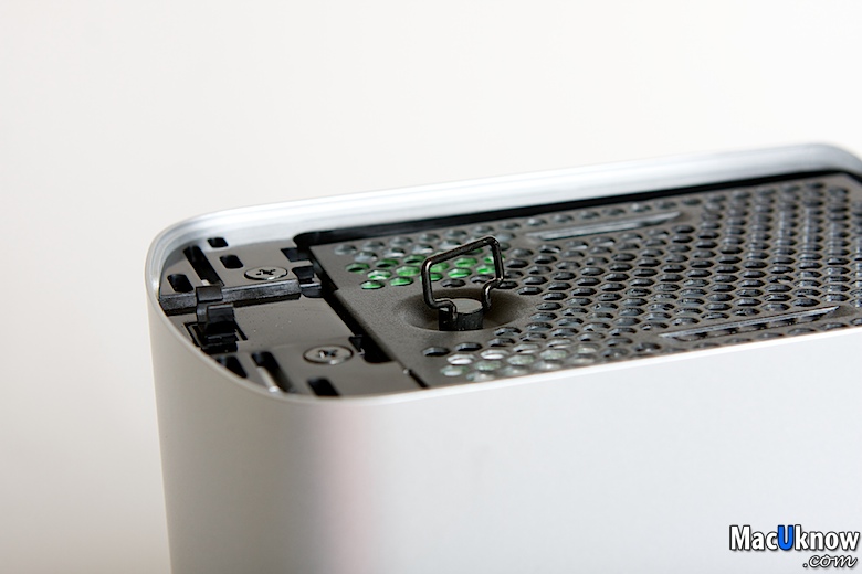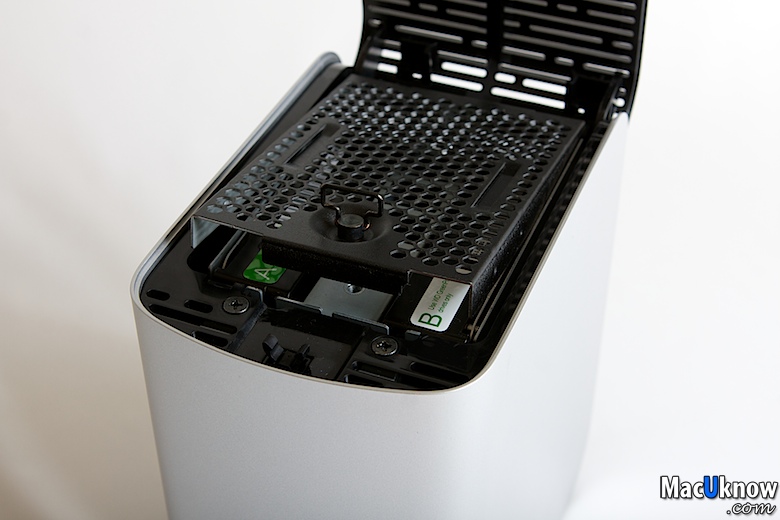 按下後,上方的散熱蓋就會彈起,My Book Thunderbolt Duo提供消費者自行更換硬碟,並且應該是可以支援熱插拔,也就是當您使用RAID 1(鏡像備份模式)有其中一個硬碟壞掉的時候,可以直接把壞的那顆直接拔起,換上新的硬碟。