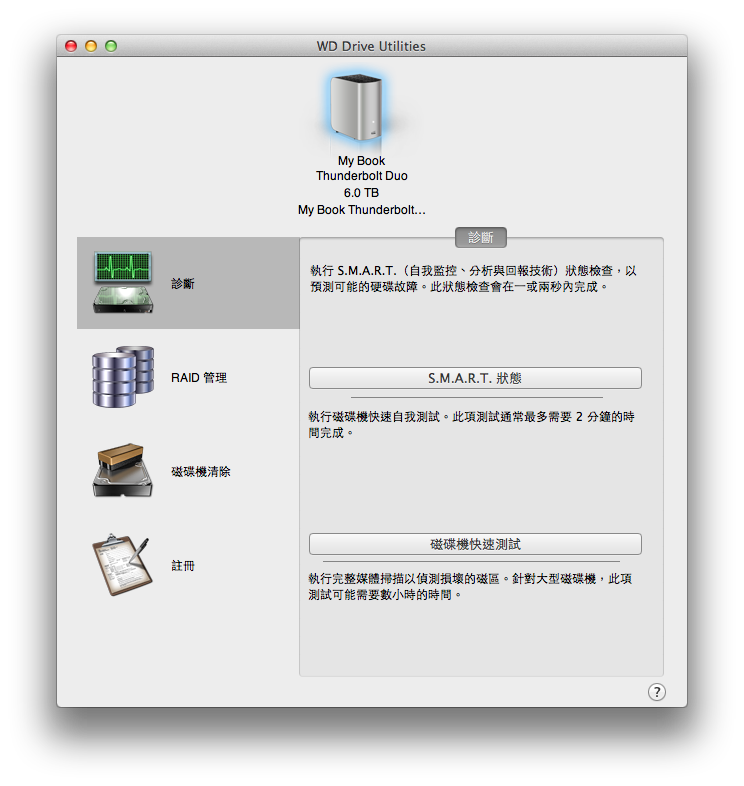 不過,這個My Book Thunderbolt Duo要調整RAID使用組態,必須要透過以下這個WD Drive Utilities程式,因此還是要先安裝起來。