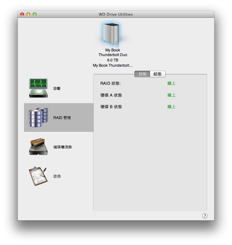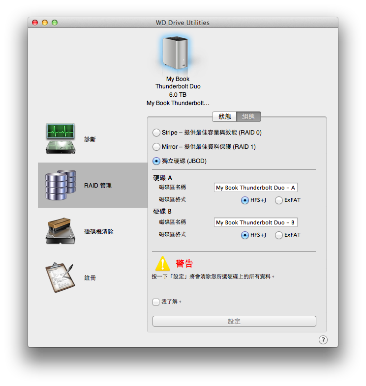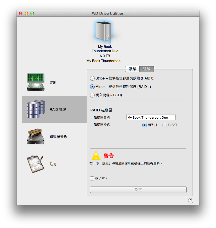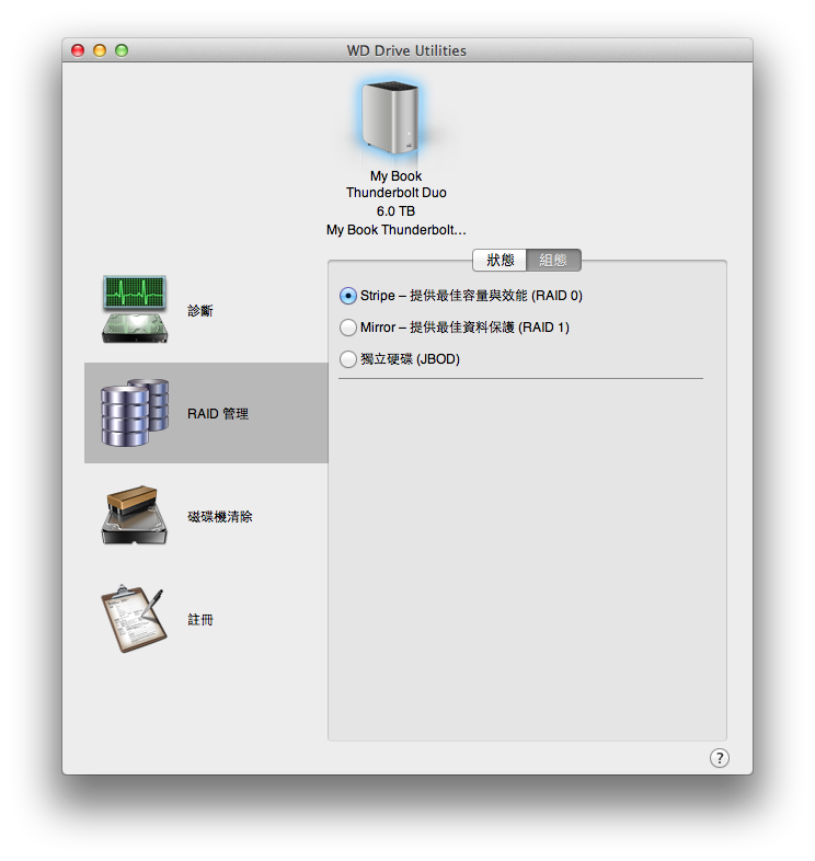 進入”組態”頁面之後,就可以調整My Book Thunderbolt Duo要怎樣用,預設是第一個RAID 0的用法。