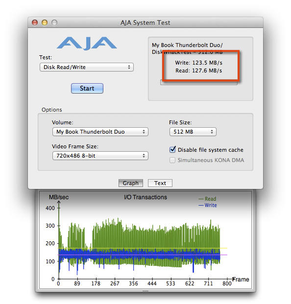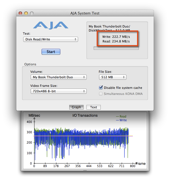 那我們就先來測測看,My Book Thunderbolt Duo預設RAID 0的讀寫速度怎麼樣?可以看到下圖,讀寫速度達到230MB/s左右,幾乎是Firewire 800的三倍左右了!!