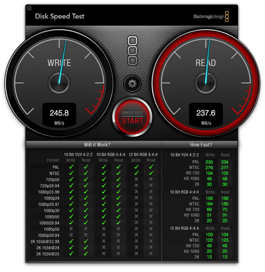 請出另外一套硬碟測試軟體 Blackmagic Disk Speed Test ,測試結果也差不多,讀寫速度都可以達到230-240MB/s!