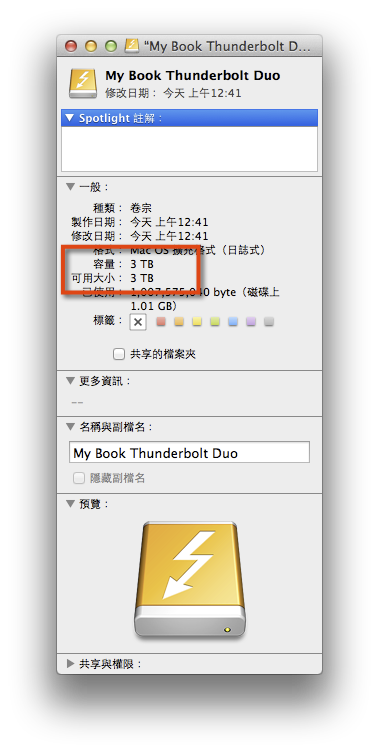 換成RAID 1模式之後,接上電腦,My Book Thunderbolt Duo就只會呈現單一個硬碟3TB的容量大小。