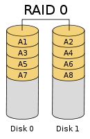 所謂的RAID 0,簡單來說,就是把一整個大的檔案,分成兩個部分寫入到兩個硬碟中,因為是同時寫入、讀取,所以硬碟讀寫速度會是單碟的兩倍。(圖片取自Wiki)