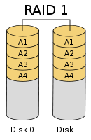所謂的RAID 1,簡單來說,就是一個硬碟不斷備份另一個硬碟的檔案,就像照鏡子一樣。(圖片取自Wiki)