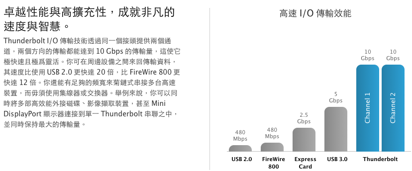蘋果在2011年3月份推出了和Intel一同開發的新傳輸介面Thunderbolt,傳輸速度為10Gbps,預期將成為往後高速傳輸的代表規格,而Thunderbolt究竟有多快,以下這張圖片取自於蘋果官網的說明網頁: