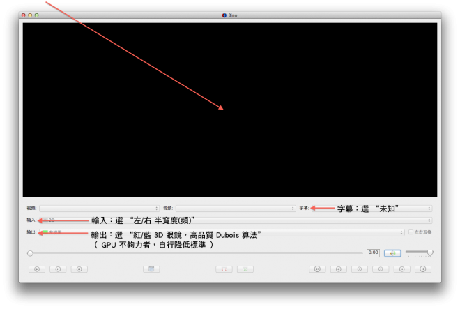 開啟 Bino 3D 軟體,將 Blu-ray 3D 影片檔與 3D 編碼字幕檔,同時直接拖入黑畫面內後,按圖索驥。
