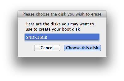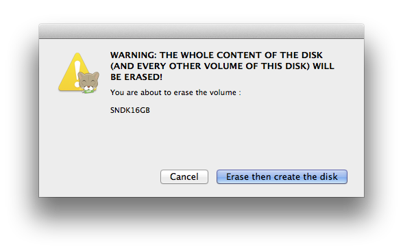 警告你那個磁區或隨身碟/SD卡上的內容將會被格式化!!按下”Erase then create the disk”就會開始製作10.8 Mountain Lion開機碟了!