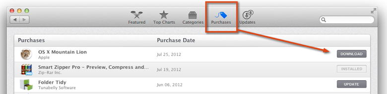 如果你已經執行安裝程式,系統已經升級成10.8了,也沒關係,請重新開啟Mac App Store,進入”Purchases”頁面,找到OS X Mountain Lion之後,按下”Download”按鈕重新下載一次。