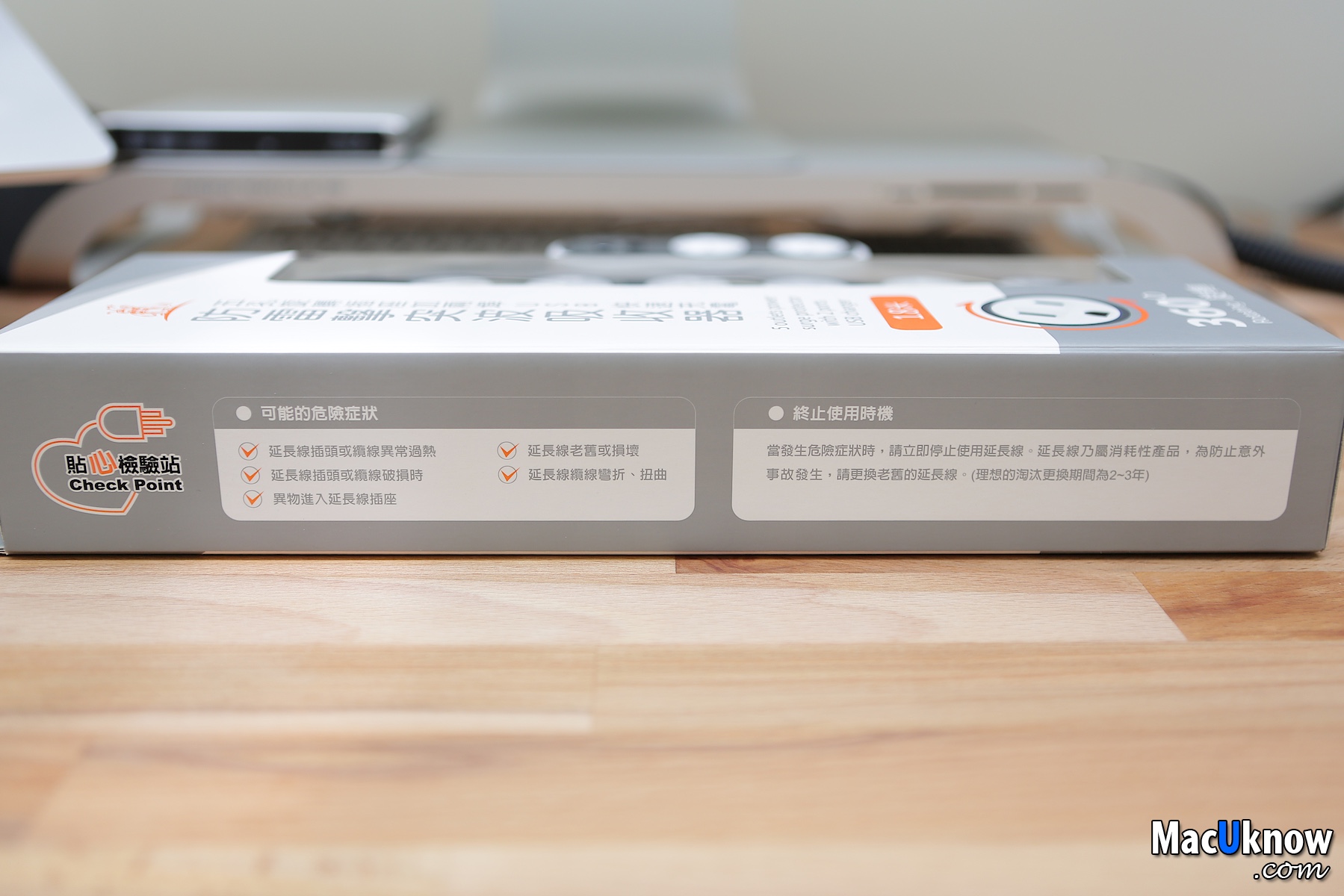 ▼包裝盒側面,貼心檢驗站,告知你其實延長線不是不會壞,也不是可以用一輩子的東西。