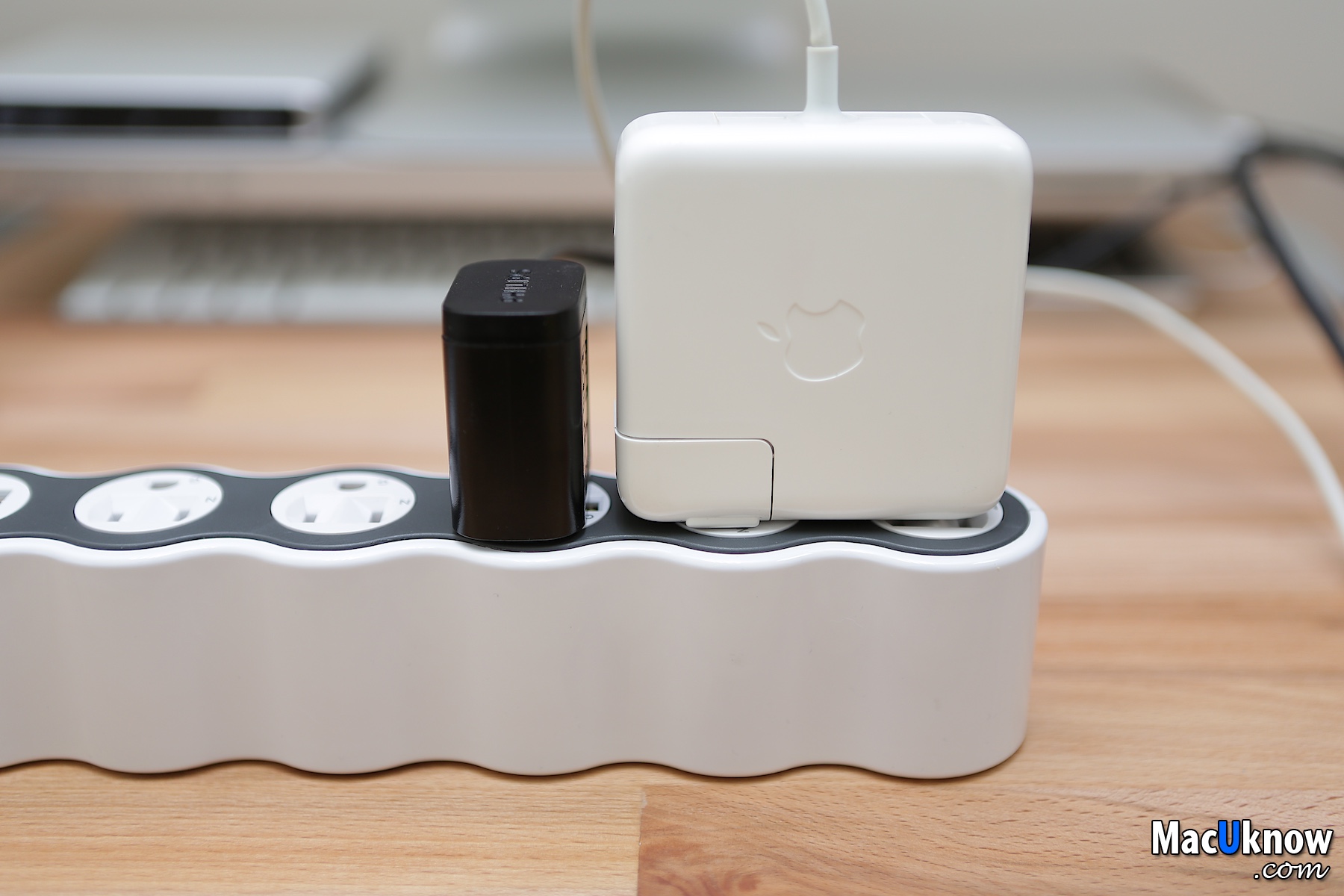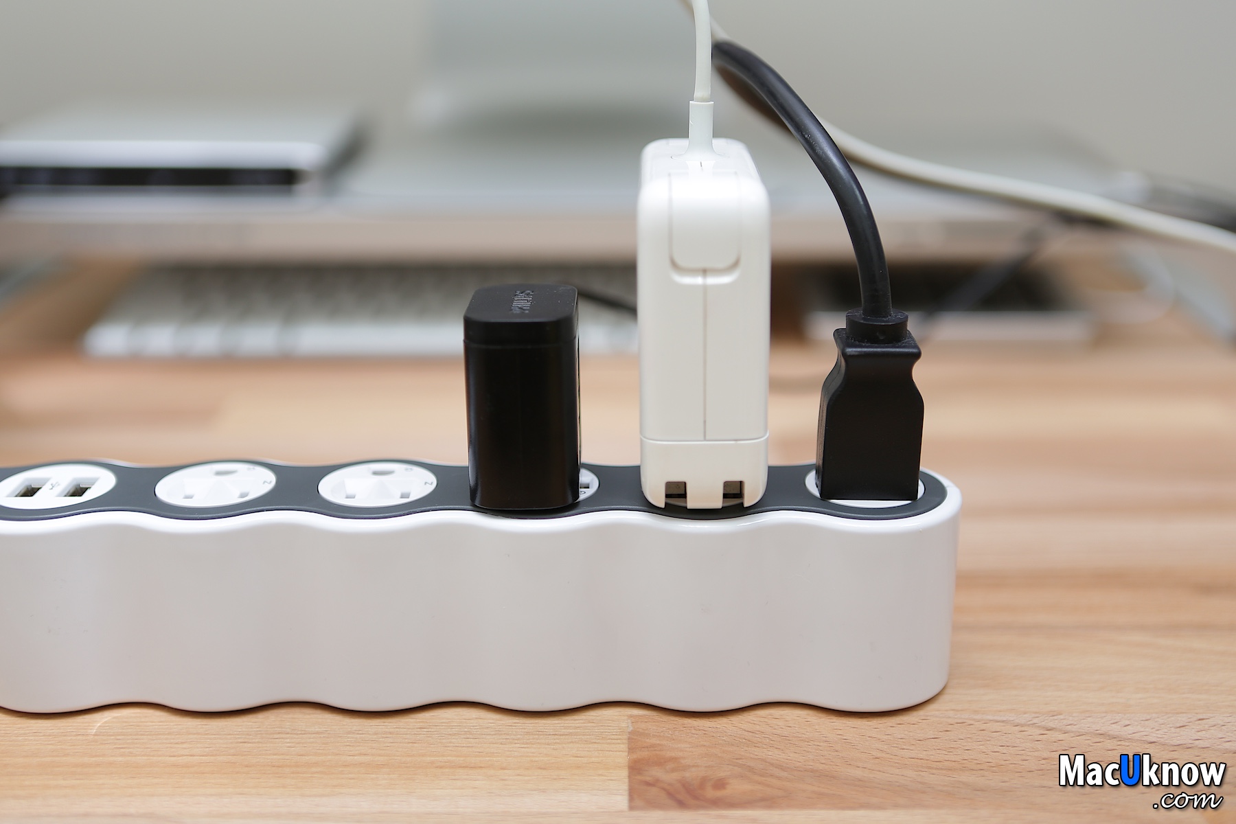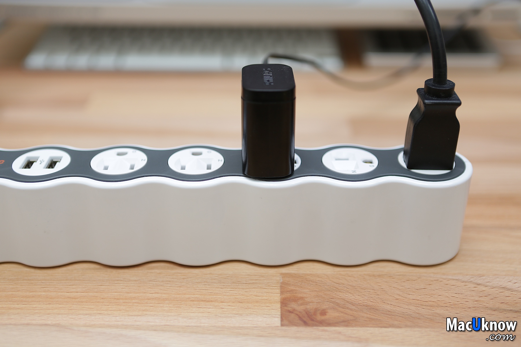 ▼然後,你看,很常出現的畫面,蘋果的電源供應器,常常也是擋住其他插座孔的兇手,一人佔兩到三個孔。