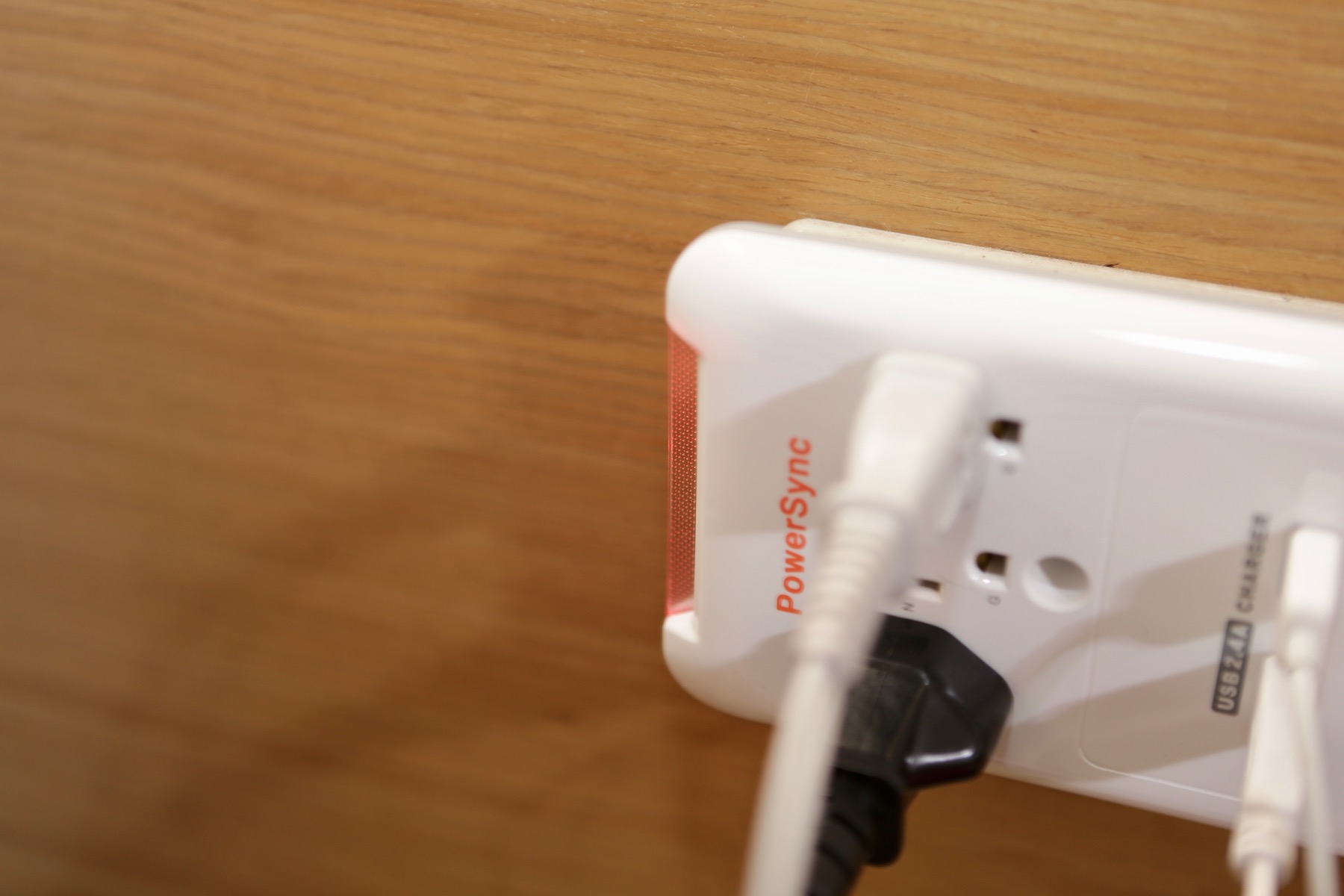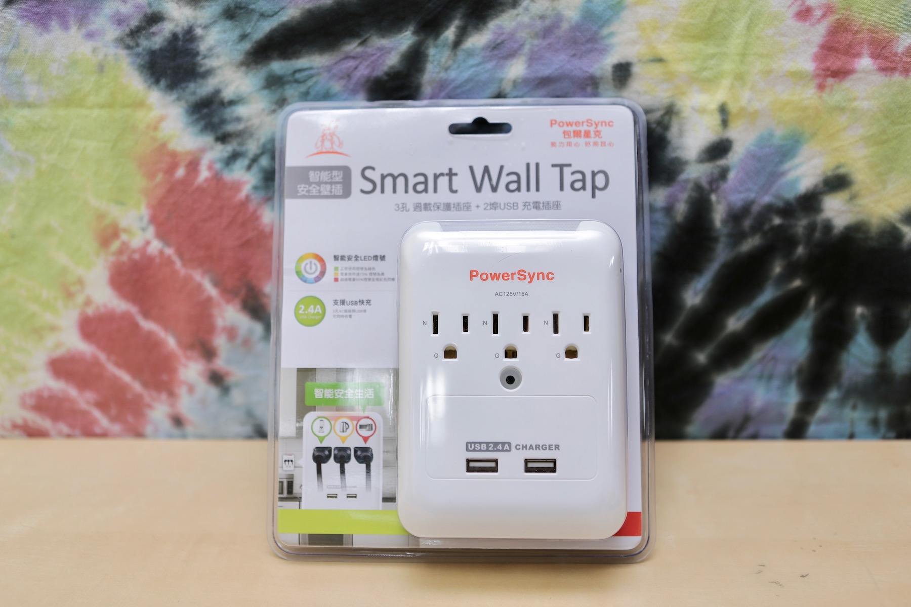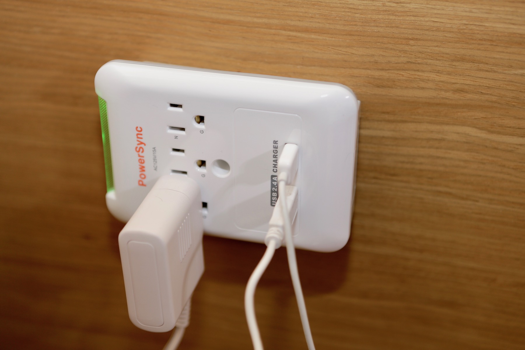 ▼ 這次借到了 PowerSync 出的壁插,他們家已經出過很多附有 USB 插座的延長線,大家評價也不錯,不過我床頭已經有一堆東西,再用延長線的話實在是太多線了。好險他們有出壁插,馬上開箱試用看看。