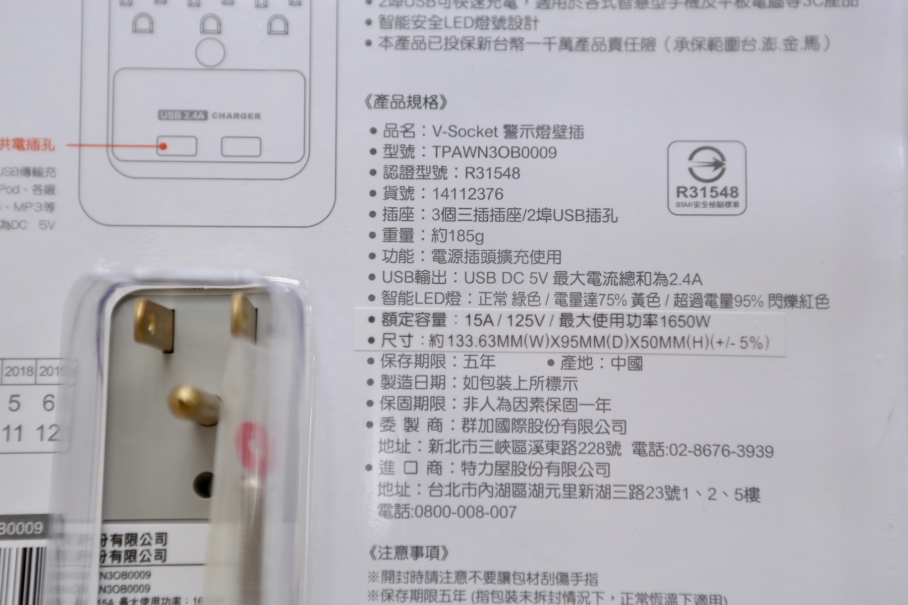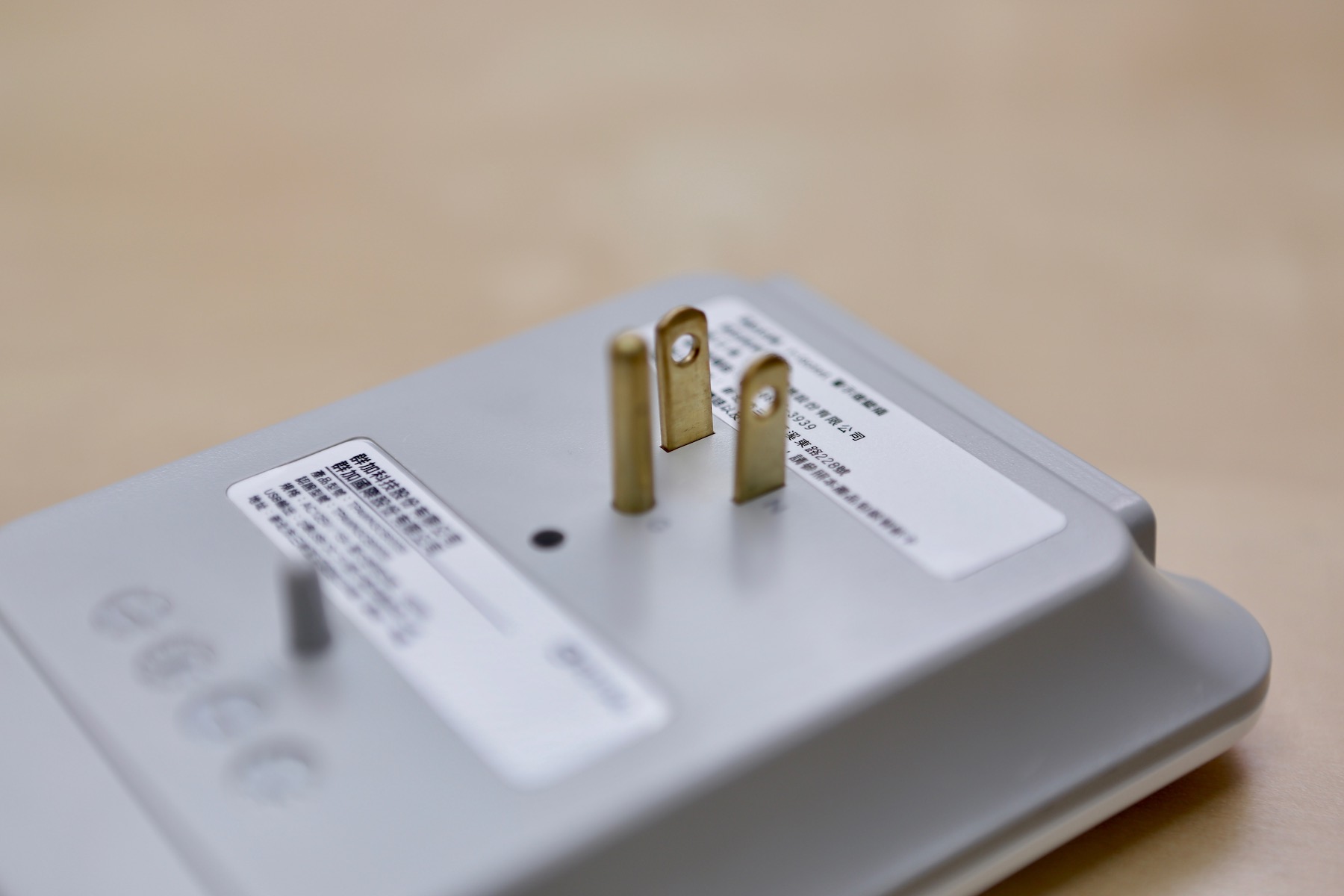 乍看之下是可以把一孔變成 3 孔外加兩孔 USB 的,不過因為這個壁插面積很大,會佔據兩孔的位置,所以其實是二變五。