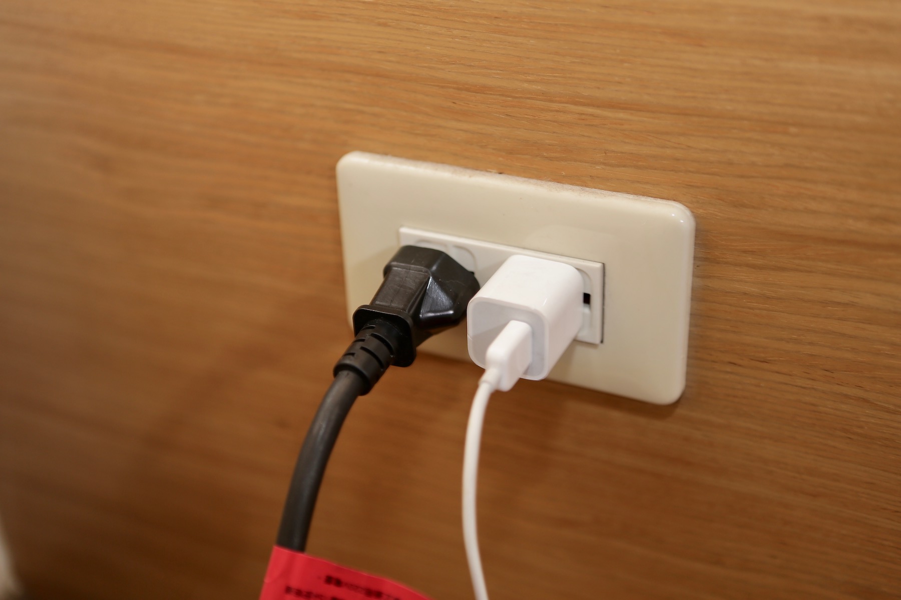 ▼ 我的床頭只有這兩個插座,但卻有一堆 3C 用品要搶著用它。其實類似的情況常常會發生,比如說廚房只有兩個孔,但也是有微波爐、烤箱、果汁機等等的用品要輪流用。所以這個壁插可以發揮在很多場所。