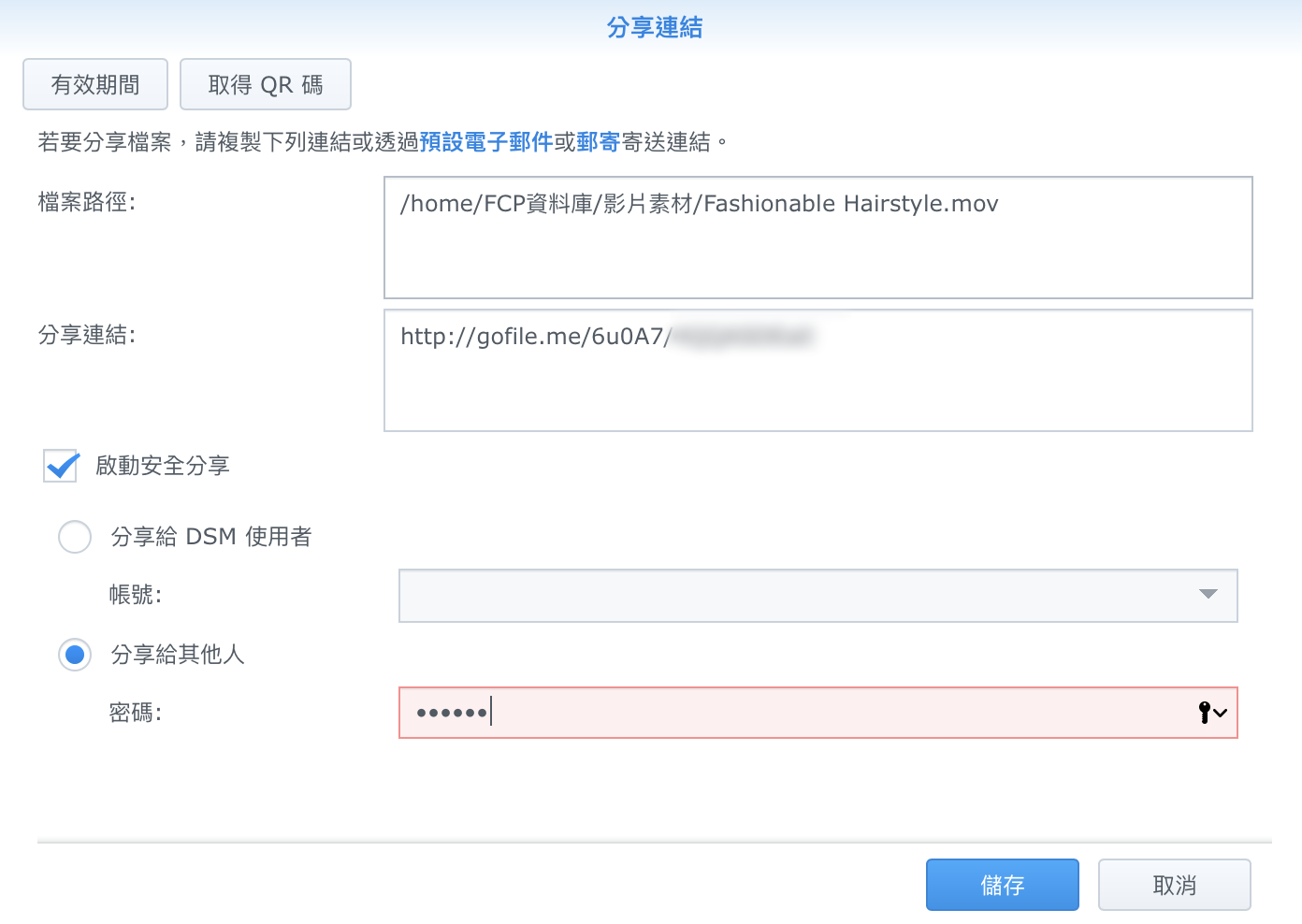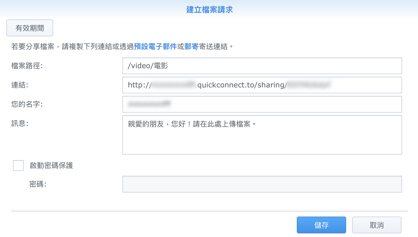 ▼ 這裡就會出現一個分享連結,我們只要把這個連結拷貝,按下儲存,把拷貝的連結傳給朋友,對方就可以下載這個檔案囉。更方便的是這裡不但可以設定密碼,還可以設定下載期限,比如說七天內有效,真的很棒。