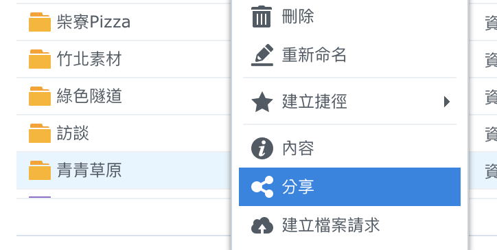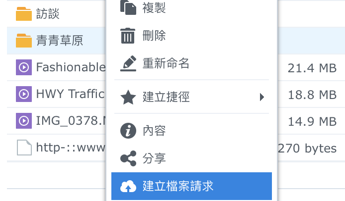 ▼ 我們不但可以分享檔案別人,在這個時候還可以分享空間給別人上傳。我們對著一個檔案夾按下右鍵,選擇「建立檔案請求」