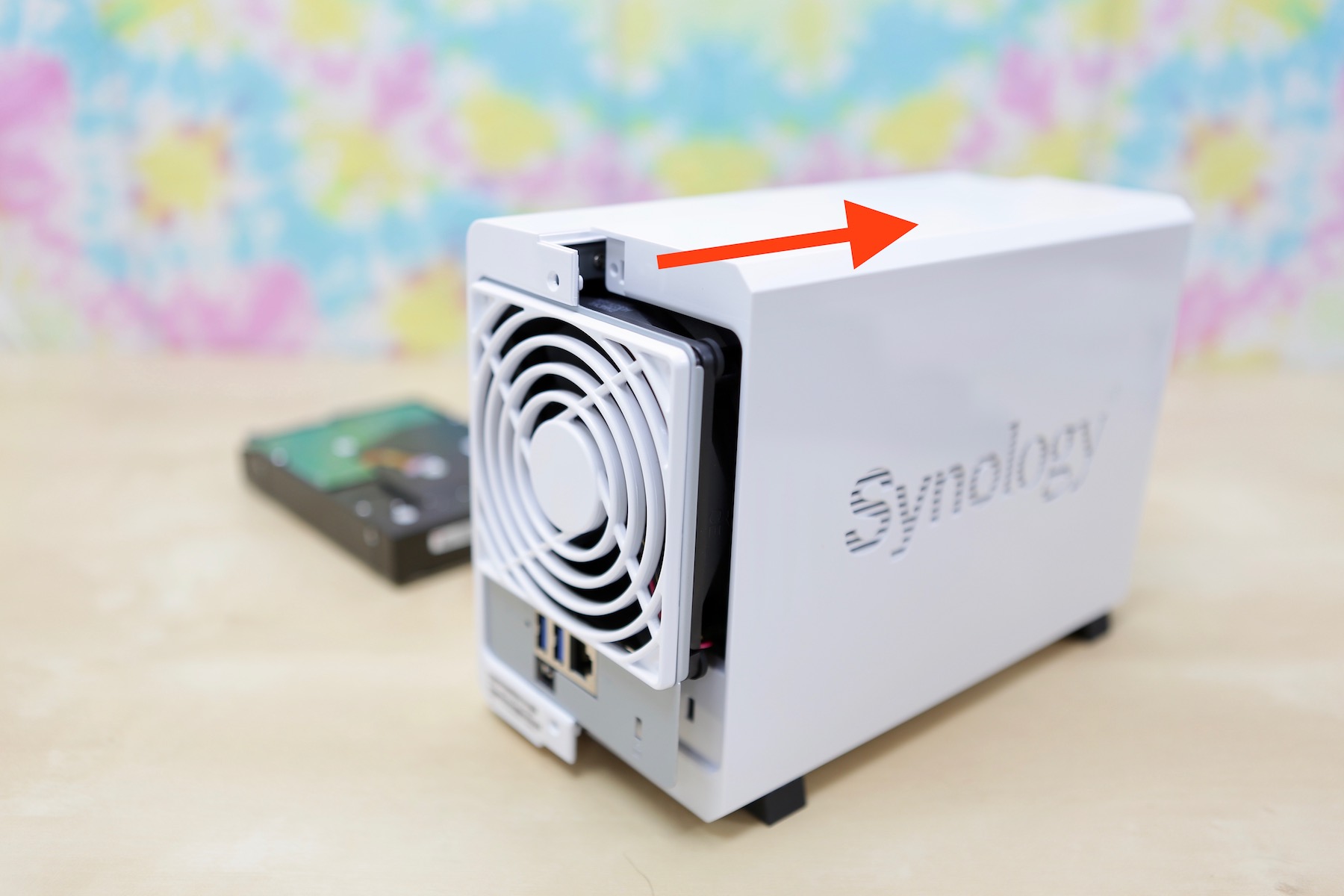 ▼ 要把硬碟安裝到 DS216j 之內很簡單,首先先把機殼這一半往前推,就可以輕鬆打開了。