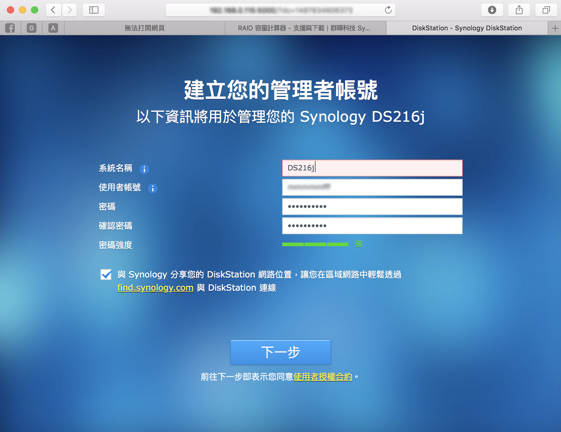 ▼ 安裝完之後就可以設定自己的帳號囉,設定帳號的用意在於如果有多人要使用,可以不同的人開不同的權限,比如某個帳號只能讀取,某個帳號只能存影音檔之類的,就算只有自己用,也還是要設定一個初始的帳號當管理員。