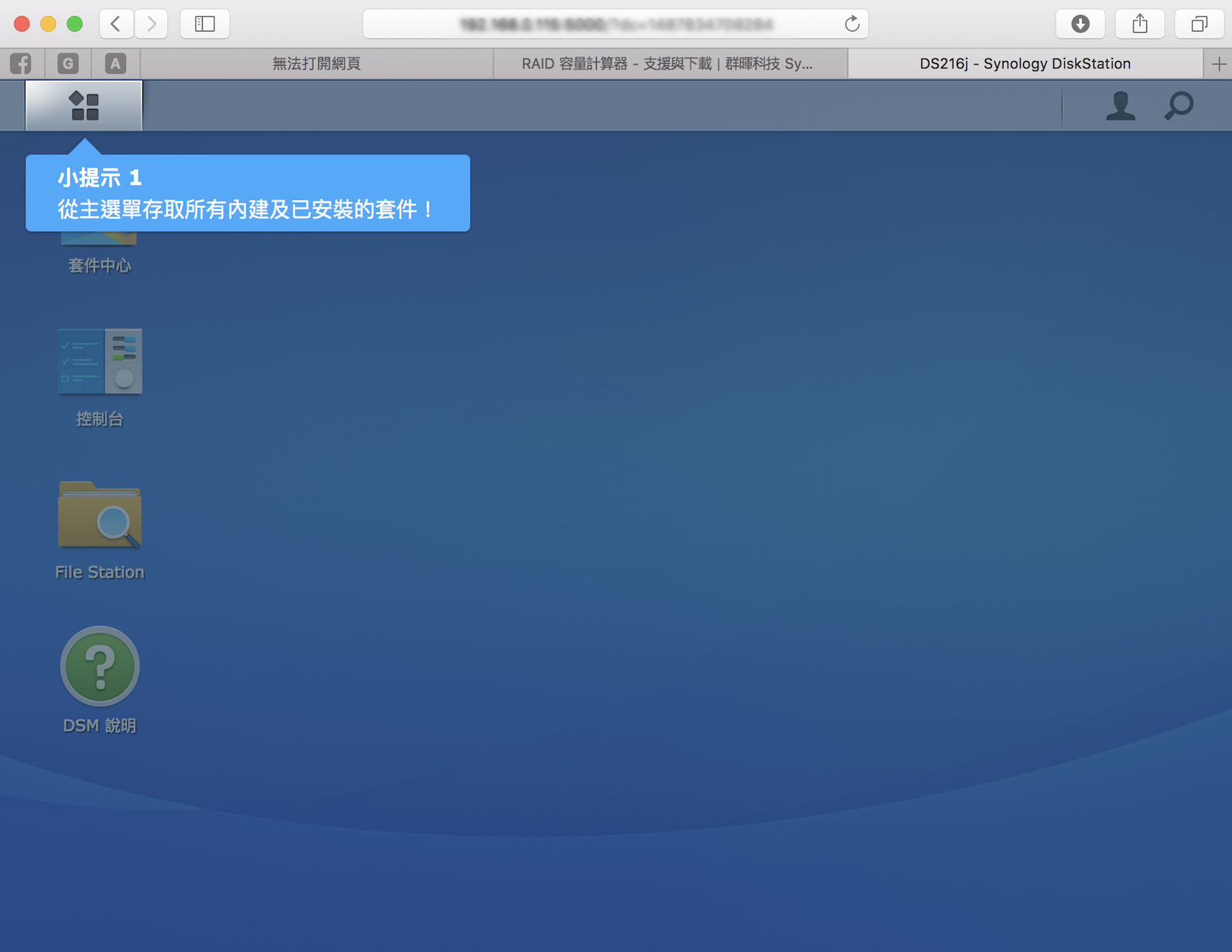 ▼ 一切都設定完成之後,就進入到 DSM 系統了,這就是 DSM 的桌面。他們系統的感覺比較像是 Windows,功能選單放在左上角,關閉視窗則是右上角。