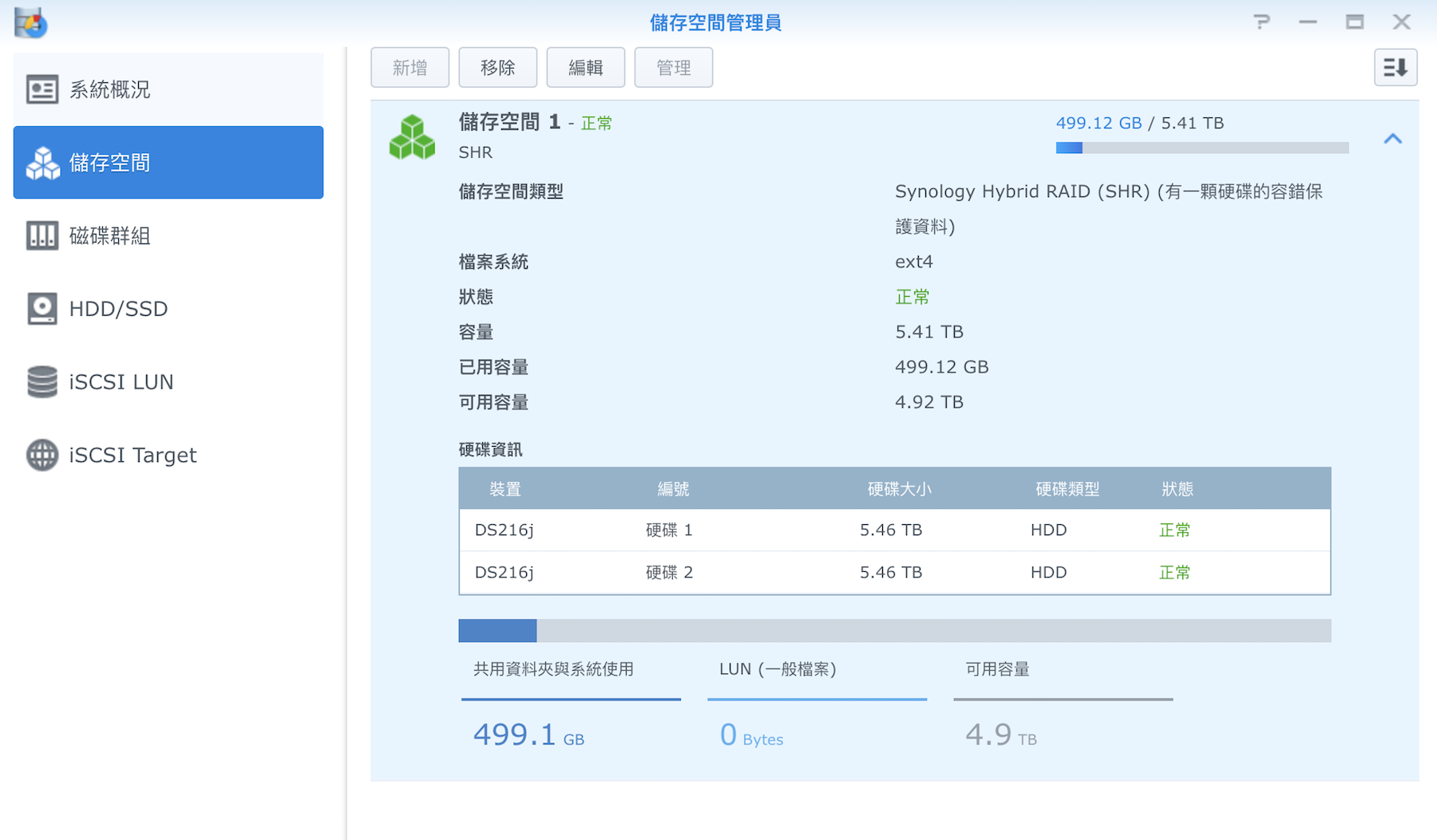 首先我們要知道,廠商標示的容量,跟我們實際能用的容量,會因為電腦換算的單位不同而有差別,通常都是打個 9 折就是實際能用的容量。再來就是我們這裡使用了 SHR 也就是 Synology 的自動化磁碟陣列(RAID) 管理系統,他會把兩顆當做一顆使用,所有的資料都會自動存成兩份,不追求容量或是速度,以安全為主軸。