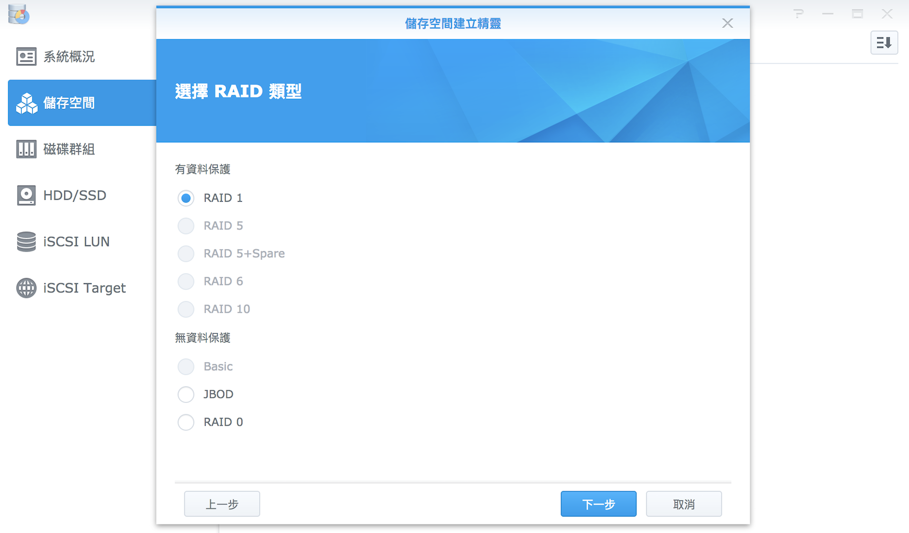 ▼ 如果不想用 SHR 模式,也可以把此模式移除之後,重新建立。在這裡可以選擇注重安全會兩份備份的 RAID 1 模式,或是追求速度的 RAID 0 模式,但受限於網路傳輸速度,基本上應該沒人會拿 NAS 來追求什麼速度,所以都會選 RAID 1 或是 SHR。