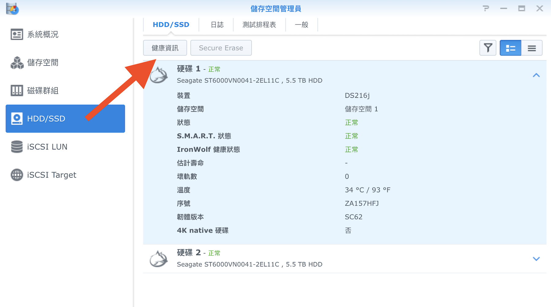 ▼ 接著一樣是在儲存空間管理員側邊的 HDD/SSD ,這裡可以看到硬碟的健康資訊。一般來說這裡每顆硬碟都會是顯示硬碟的圖案,不過這次 DSM 6.1 有跟 Seagate 合作推出獨家的 IronWolf 健康管理功能,所以這可以可以看到 IronWolf 的 ICON,表示他支援此功能。我們除了可以看到基本的硬碟資訊之外,還可以按下上方的 「健康資訊」功能。