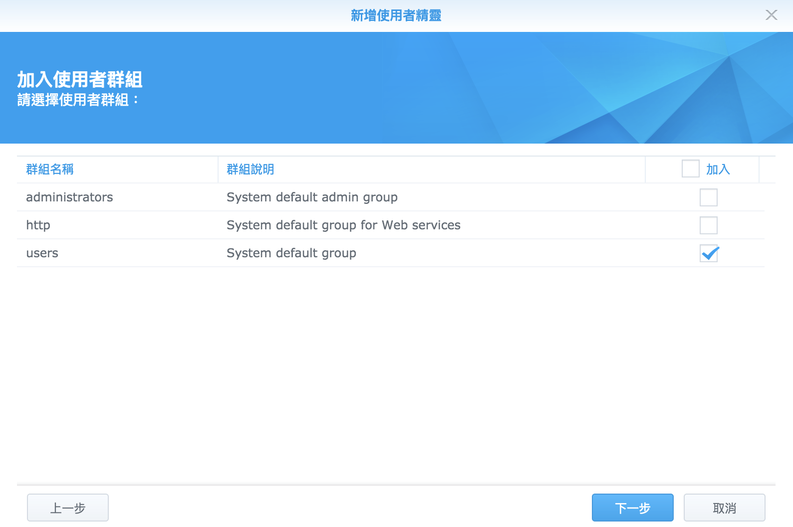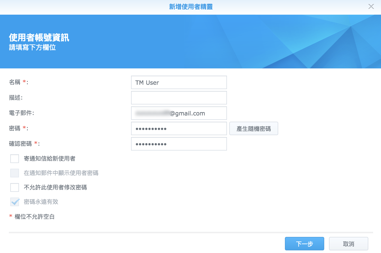 當然,其實現在我們已經可以開始設定讓電腦透過 NAS 來無線 Time Machine 備份了。不過如果就這樣直接備份的話,總有一天光是 Time Machine 就會把我 NAS 空間全部吃掉的,所以得幫他設個容量限制才行。所以在使用 Time Machine 之前,需要新增一個帳號來專門使用 Time Machine,因為 Synology 有限制帳號配額的功能,就是利用這點來實行。