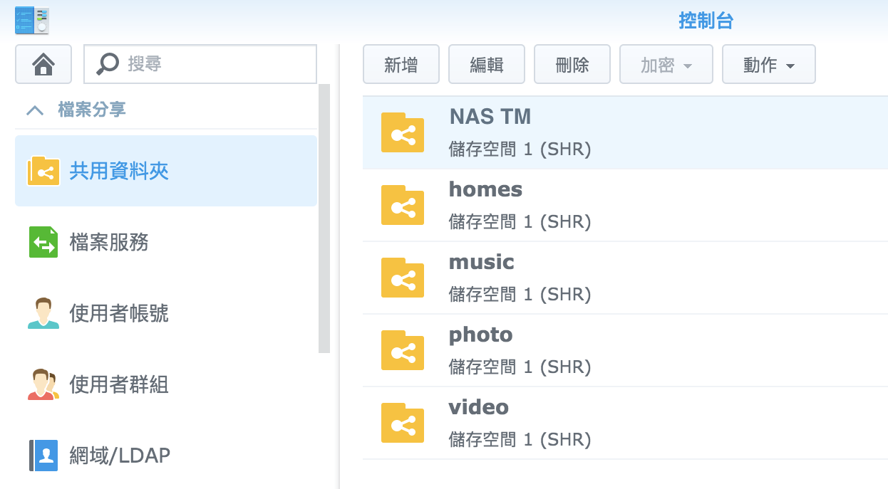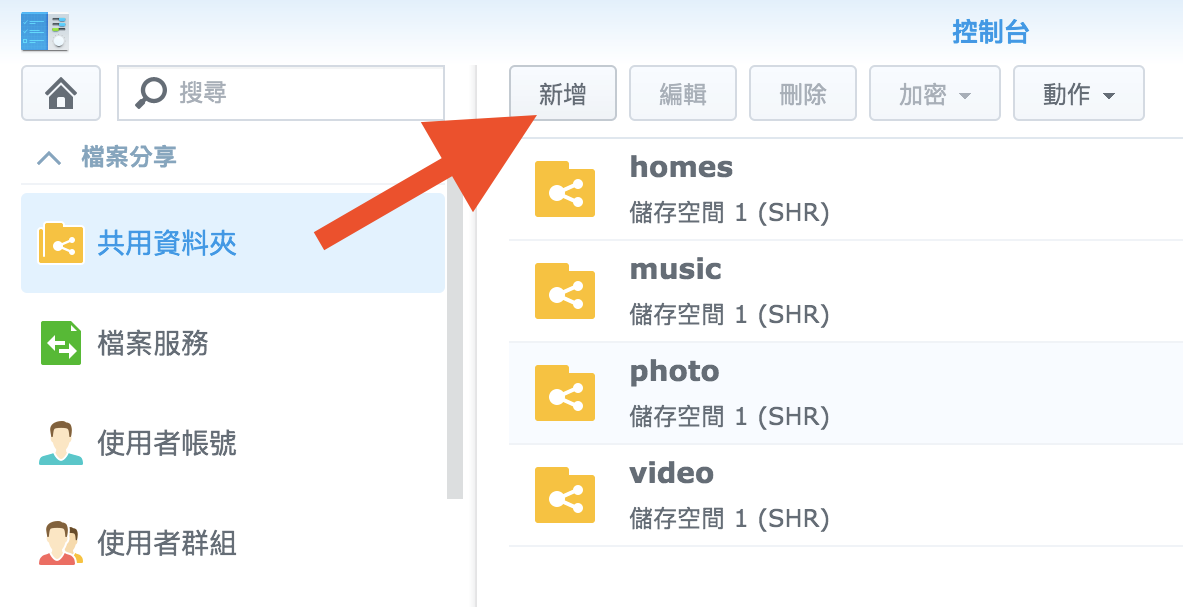 ▼ 接著我們來建立一個新的共用資料夾,這個步驟不是必要,你也可以備份到他預設的 photo 或是 video 等等,但我覺得那樣名字不符合感覺怪怪的。所以我還是新增一個 Time Machine 的共用資料夾。