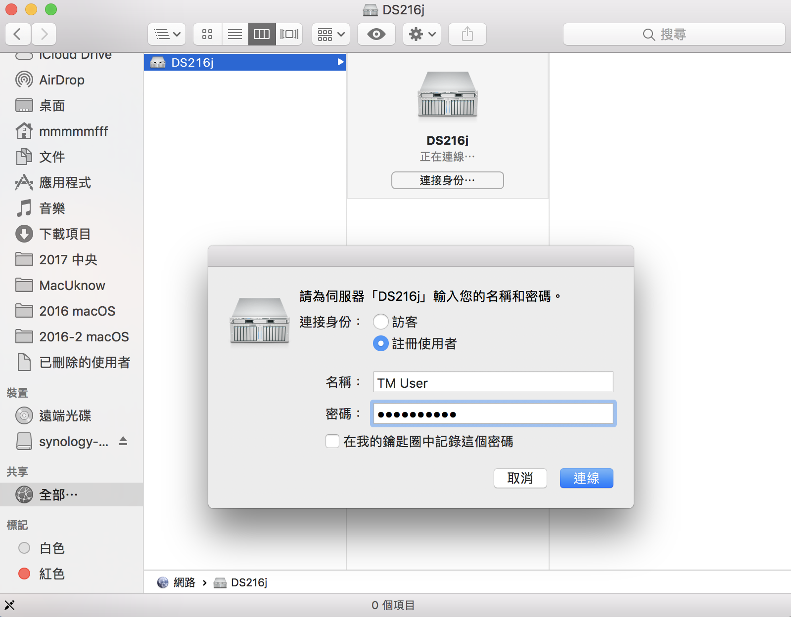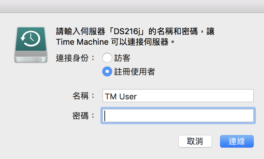 ▼ 首先我們先到 Finder 側邊欄,選擇 NAS 之後,按下連接身分,使用 TM User 的帳號登入。