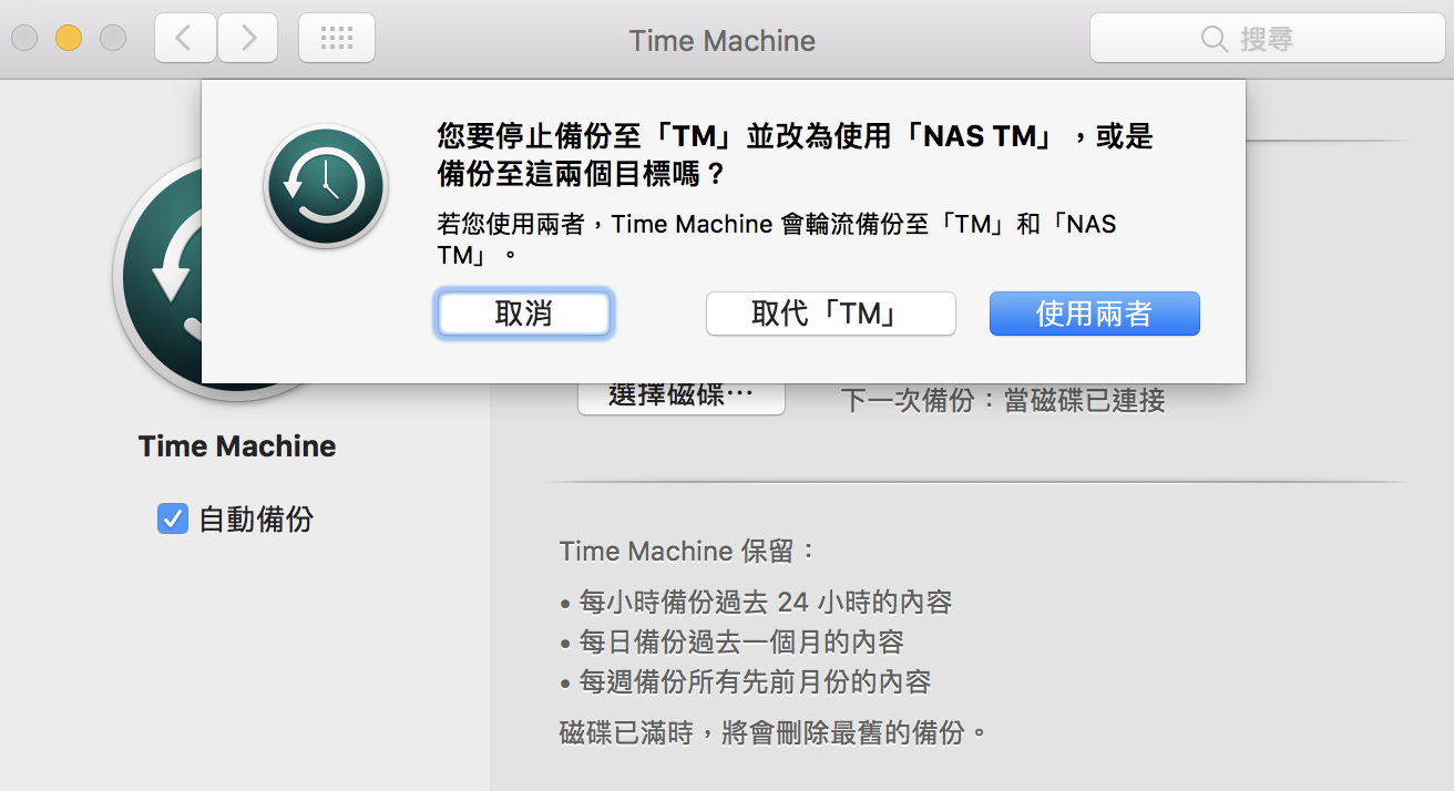▼ 如果原本就有拿硬碟來備份的話,這裡就選擇使用兩者讓原本的也繼續備份,備份是不嫌多的。