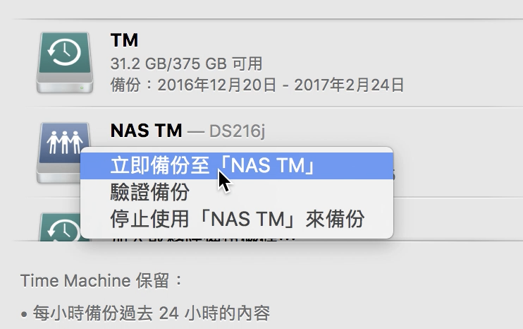▼ 現在就可以看到我們同時有兩個 Time Machine 備份囉,一個走有線的行動硬碟,一個是無線的 NAS,事不宜遲,我們就按下立即備份吧。由於第一次備份的檔案是最大最完整的,加上剛剛我們有提到無線網路的訊號不一定是最完美的,所以第一次備份會花上好幾個小時甚至半天是要有心理準備的,之後會每隔一小時就自動備份,到時的資料每次只有幾G 就很輕鬆了。