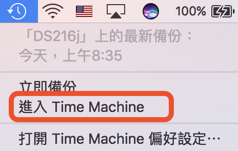 ▼ 等備份完成之後,就算不小心刪掉什麼檔案,或是修改到什麼不能修改的檔案。只要按下上方選單列的「進入 Time Machine」。
