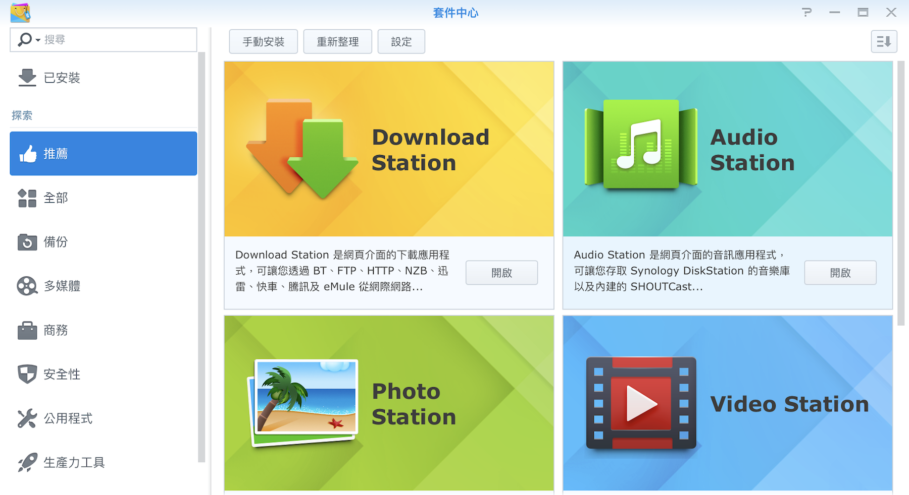 ▼ Synology 除了內建的功能之外,他還有套件中心可以下載各種應用,有點像是 iPhone 的 App Store,裡面有各種好用的程式,看你是要架網站、架 Server 都可以,我們先介紹一般人比較會用到的功能 Download Station,他就是可以幫你無腦下載的下載中心。