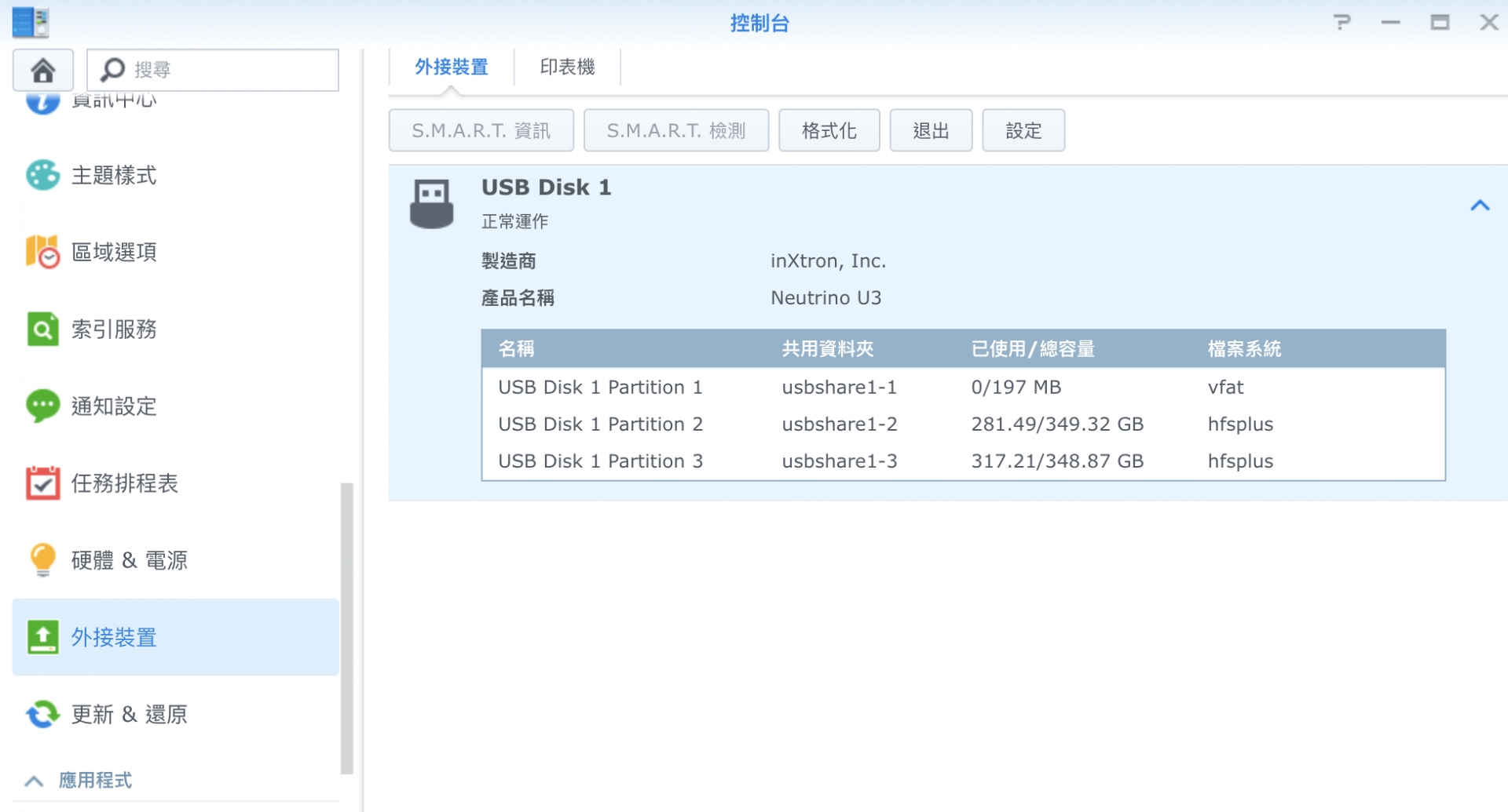 ▼ 把 USB 隨身碟或是行動硬碟插上 DS216j 之後,都可以在控制台的外接裝置看到他。無論是要把 NAS 資料複製到外接硬碟,或是把隨身碟的資料複製到 NAS 之中都沒問題。