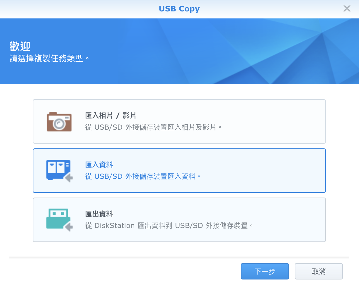 ▼ 開啟之後,就可以選擇是要從哪邊匯入哪邊。所以,如果是要備份相機中的 SD 卡,比起先放到電腦再傳到 NAS,不如直接插上 NAS 去備份快多了,少一個步驟。