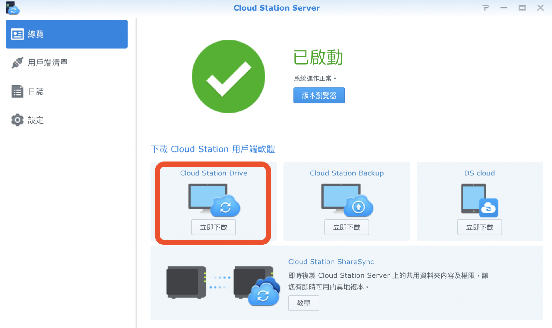 ▼ 當然沒問題,首先我們要下載 Cloud Station Server 這個套件,然後選擇 Cloud Station Drive,他會需要安裝一個小軟體。