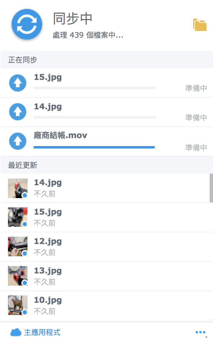 ▼ 設定完成之後,他就會像是 Dropbox 一樣在上方選單列會有一個小圖示,接著開始自動同步你的檔案囉,而且他會隨時偵測有沒有什麼檔案是新的,就自動同步。