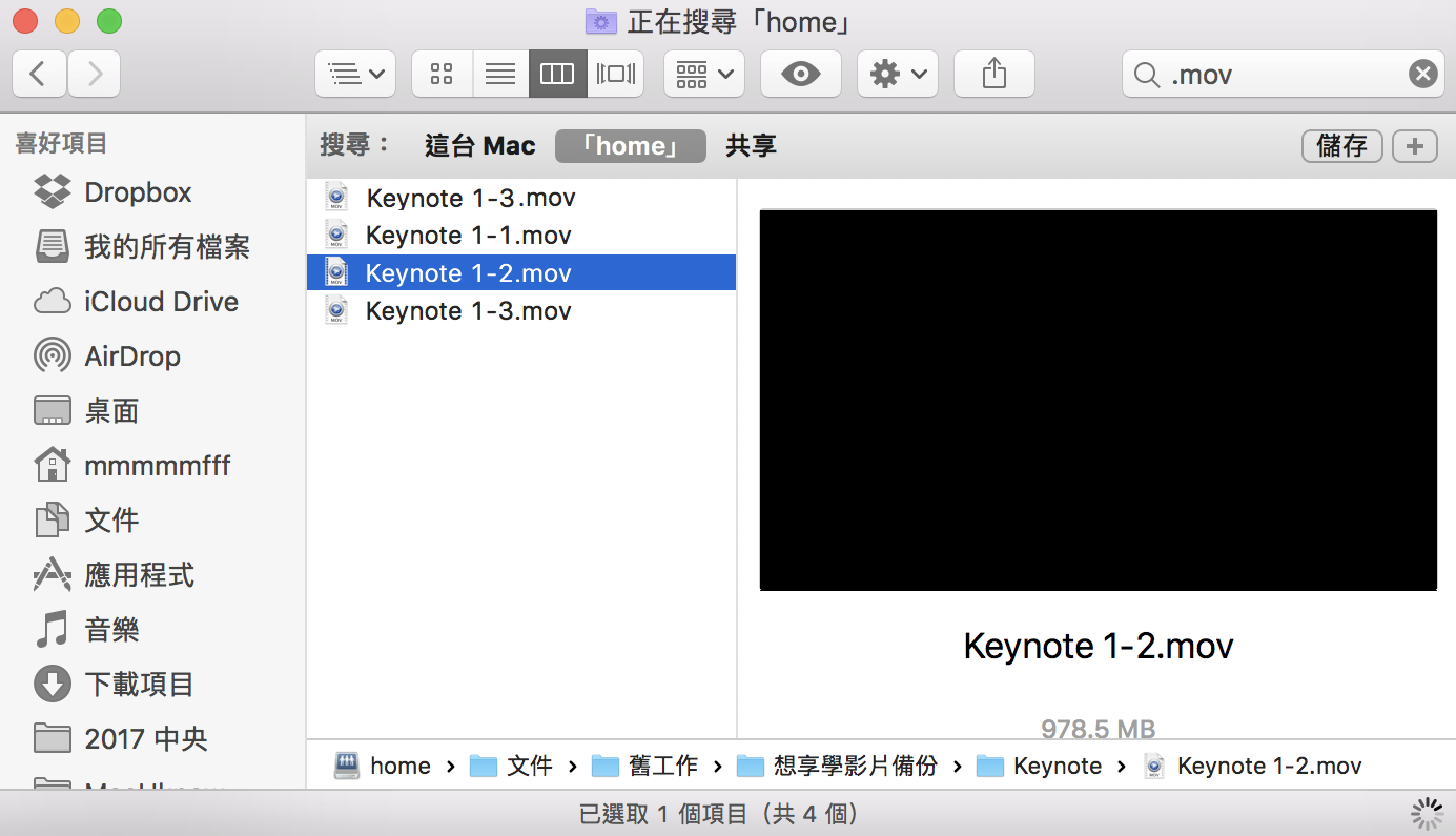 ▼ 然後我們一樣是用 「.mov」去搜尋,幾乎是立刻就找到了所有 mov 檔案,又快又準。而且左邊可以依照不同的分類去檢視。(不過既然我是找 mov 檔,當然幾乎所有都是影片檔。)