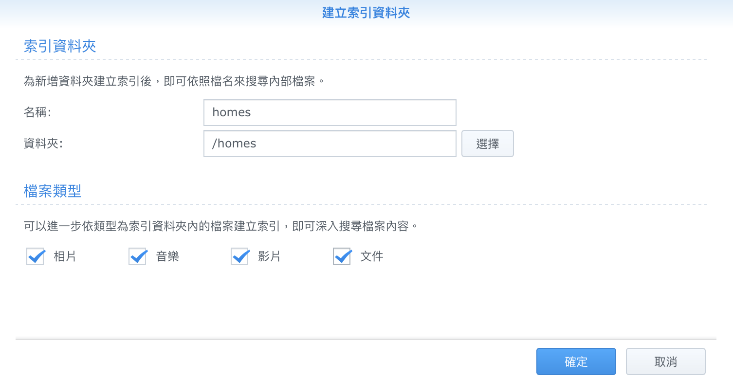 ▼ 然後建立索引資料夾,下面的勾勾可以保持打勾,等等他就會幫你把找好的資料用這些類型區分開來。