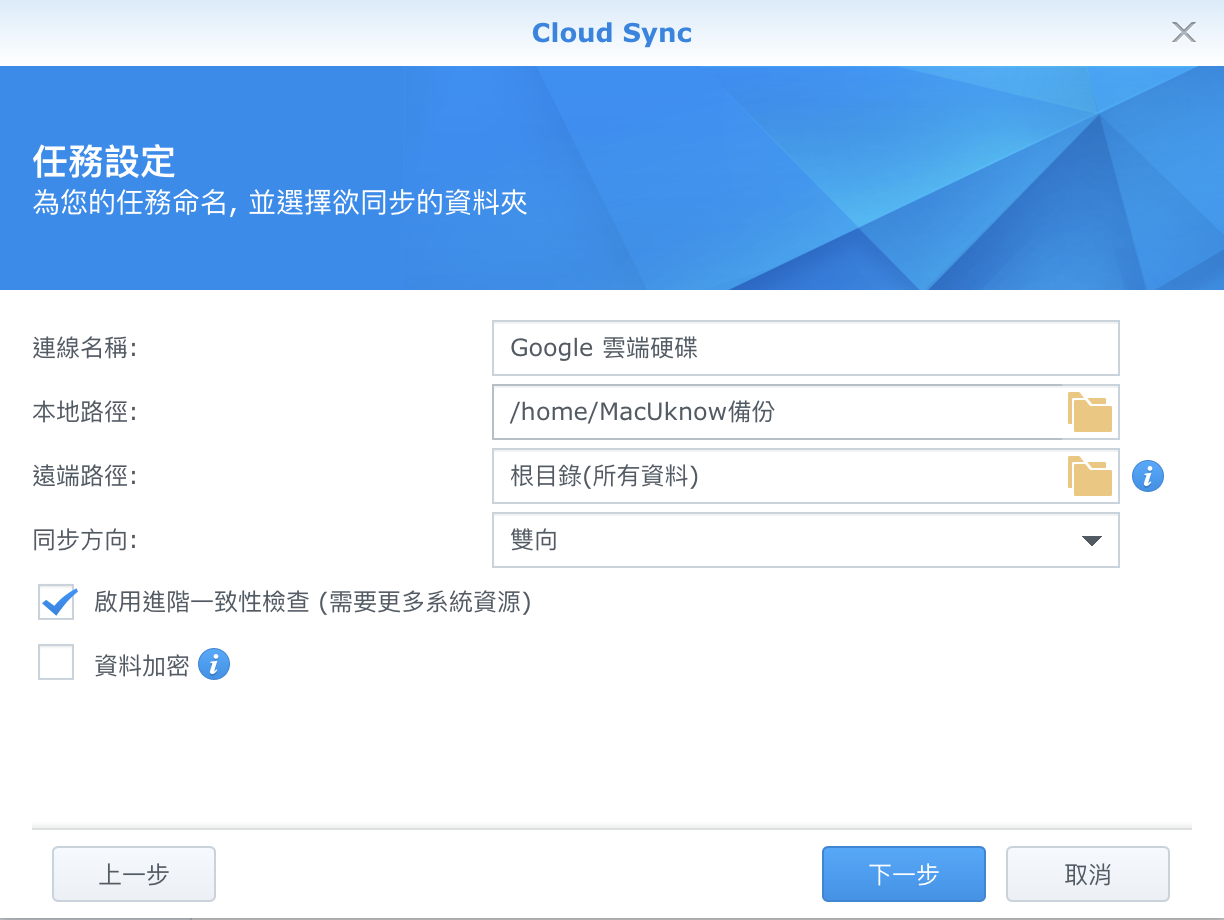 ▼ 假設我們是用 Google Drive 的服務,我可以選擇他要同步我 NAS 中的哪個資料夾。由於這些雲端服務都有容量上限,所以通常不太可能可以備份整個 NAS,通常是選擇比較重要的那幾個讓他自動同步。