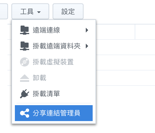 ▼ 如果要管理分享過的連結,可以在隨意一個 DSM 中的資料夾上方的工具,選擇 「分享連結管理員」。
