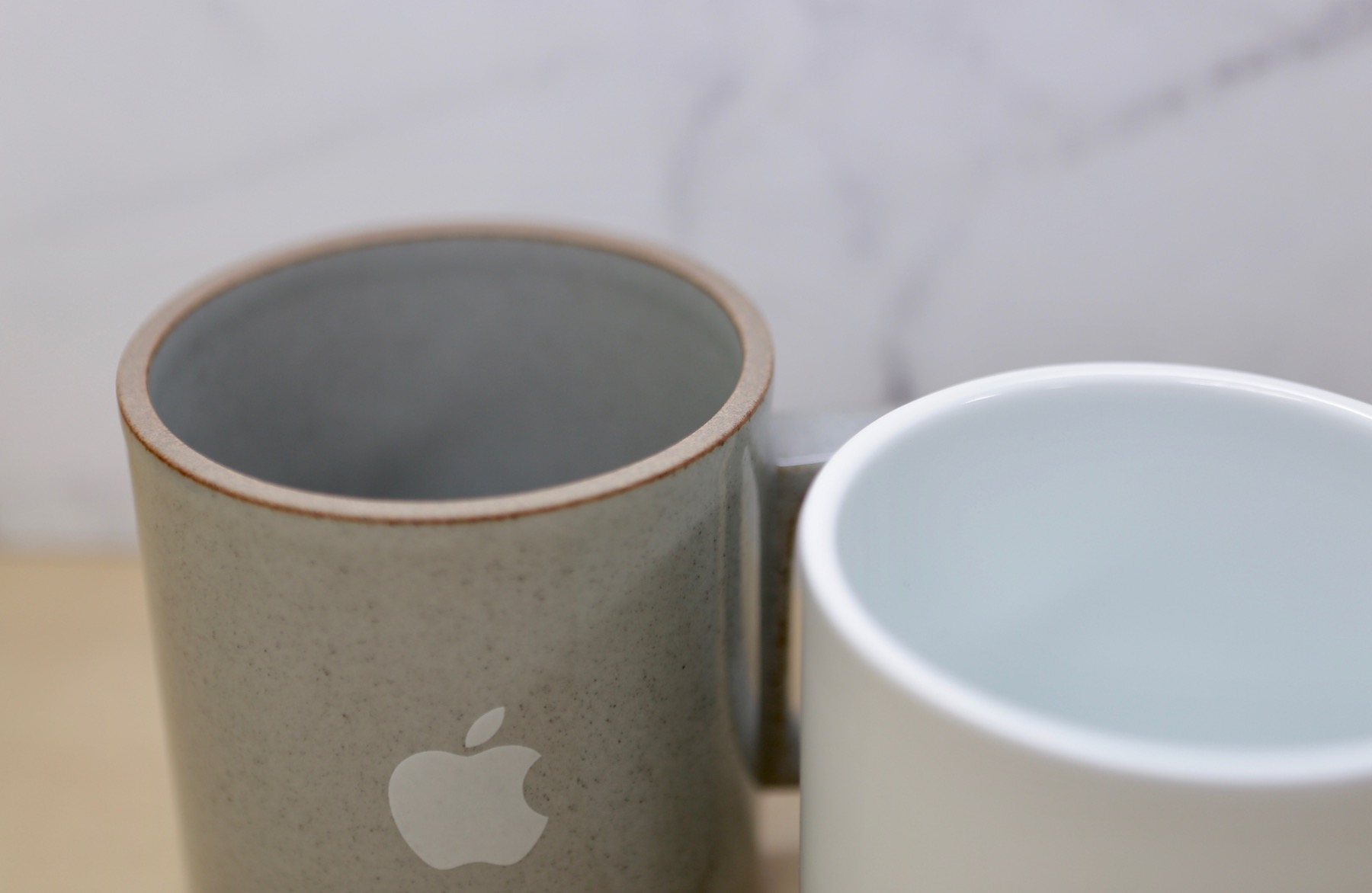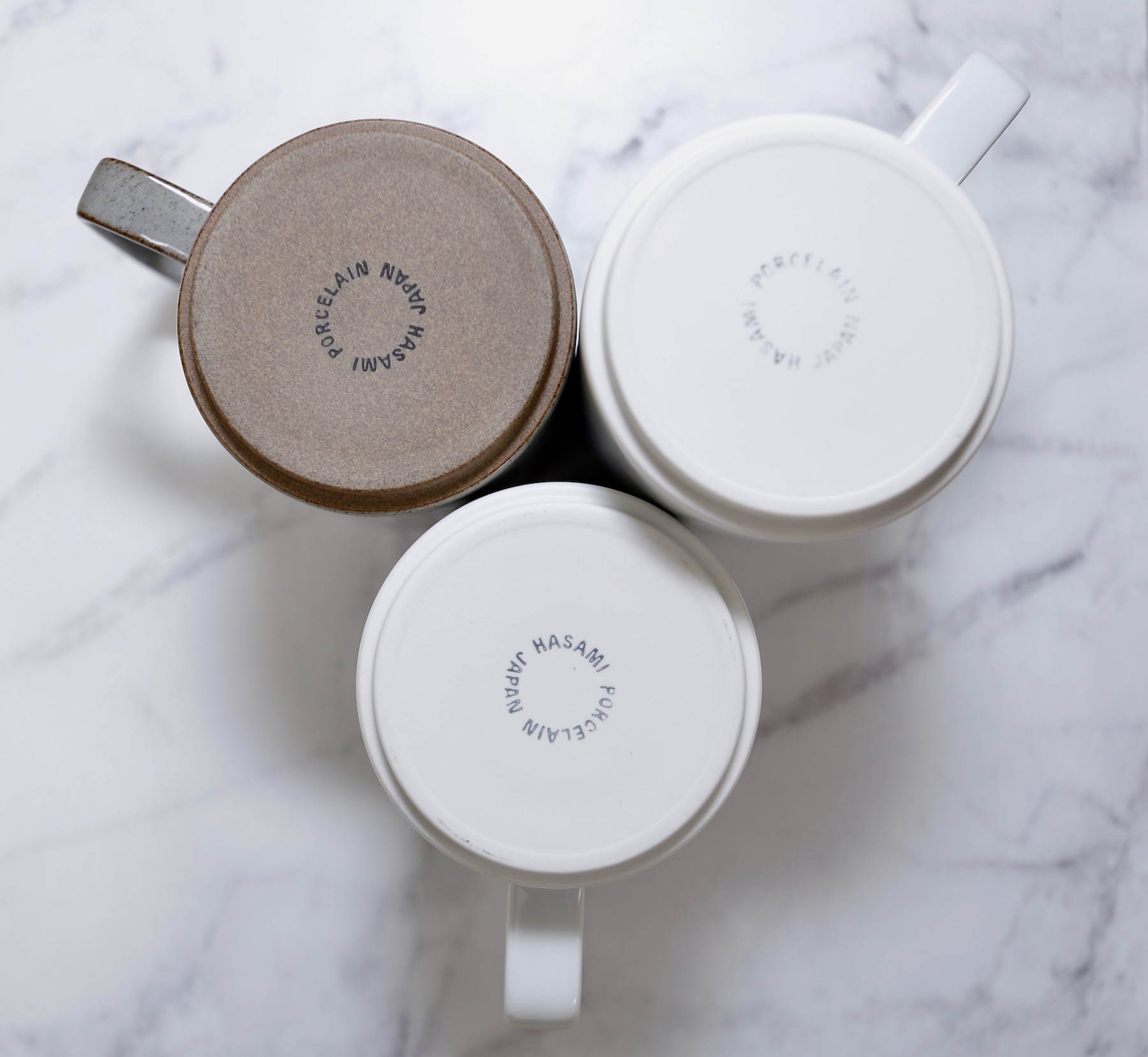 ▼ 把這次的兩個馬克杯,跟之前的一起翻過來,後面都印有 Hasami Porcelain Japan 代表這是日本波佐見的瓷器,波佐見町是日本的陶瓷歷史重鎮,大概就像我們台灣的鶯歌。所以蘋果算是跟波佐見燒做了聯名吧。