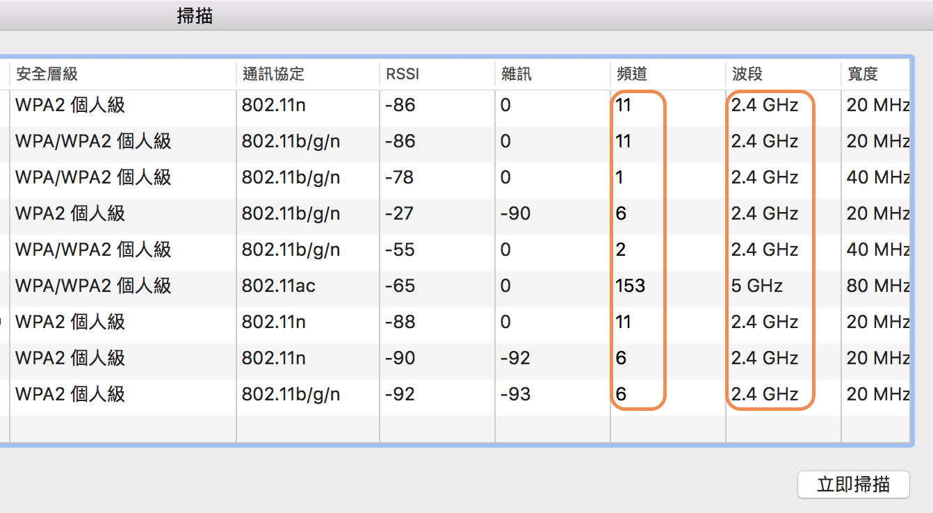 ▼ 往右邊滑動視窗就可以看到這些 WiFi 是使用哪些頻道。以圖片來說,2.4G 的頻道幾乎都集中在 11 跟 6 這兩個頻道,所以這兩個就是我們要避開的。