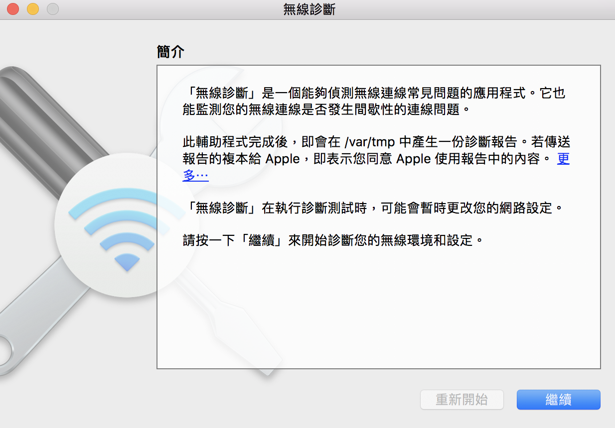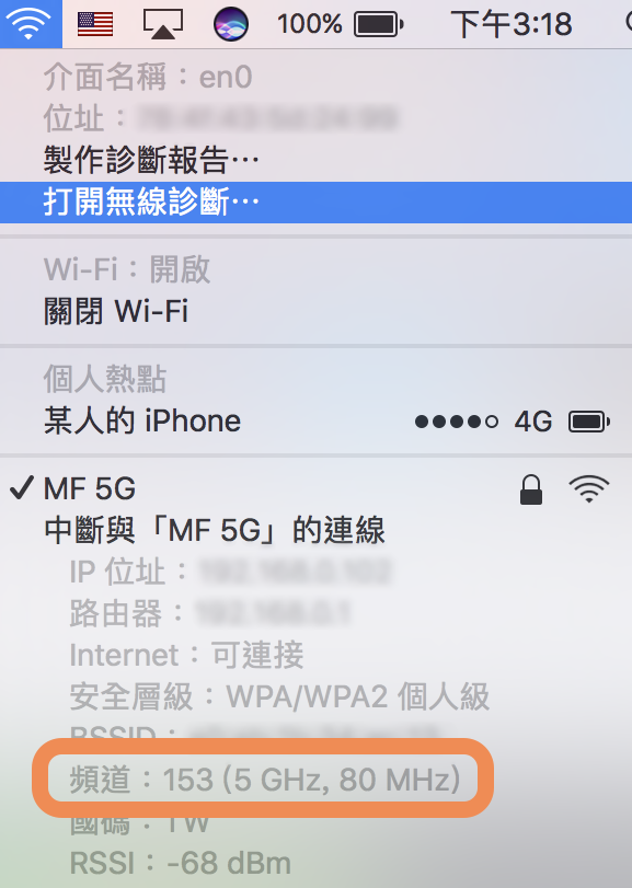 ▼ 當我們在上方選單列點選 WiFI 時,只要先按下鍵盤的 Option 再點選,就可以看到目前使用的 WiFi 頻道是多少。但現在知道我們自己的不重要,重要的是要知道這附近的人都是用哪些頻道,我們要避開。所以這時候可以按下「打開無線診斷」