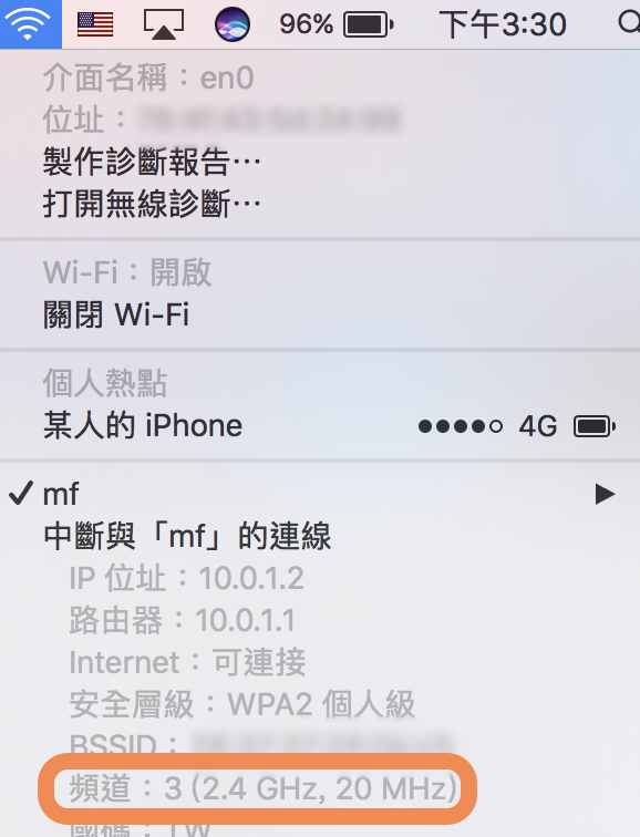 ▼ 之後我先按下 Option 選 WiFi 時就可以看到我家的 WiFi 頻道已經設定成 3 了。