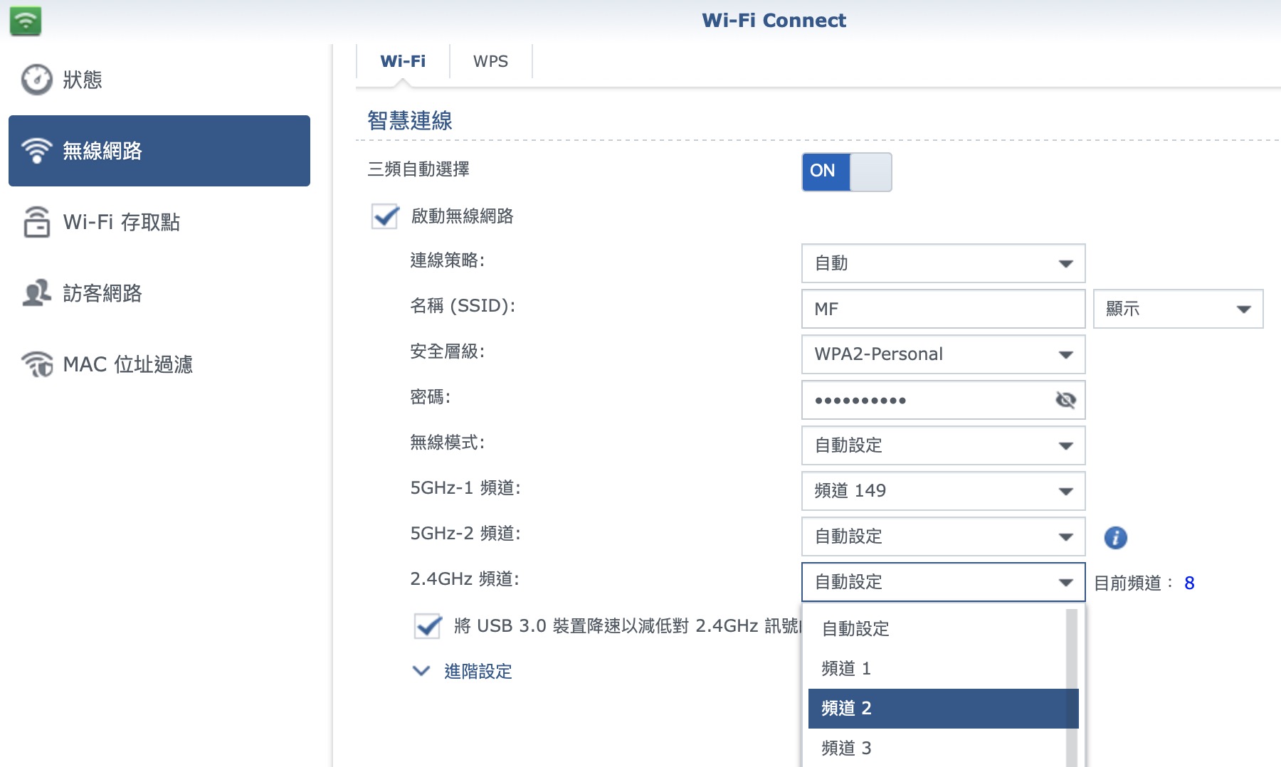 ▼ 這裡如果原本是「自動」他很有可能就幫你預設塞到爆的 11,所以我們就來幫他指定我家附近沒有的頻道。以原理來說 1、6、11 這三個應該是比較不會被干擾的,不過前面可以看到我家附近 6、11 兩個都塞了不少,所以我可以選 1 或是自己多嘗試幾個,這裡我就設定成 3 來示範。