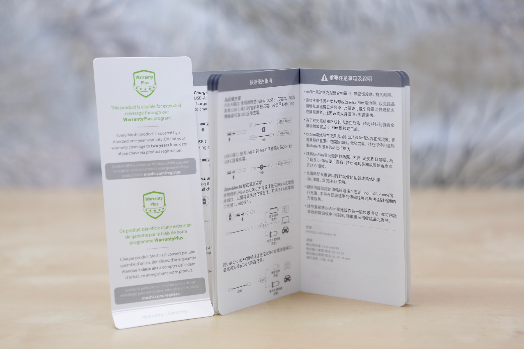 ▼ 打開包裝之後一樣會看到說明書跟提醒你要上網註冊保固,moshi 的一大賣點就是保固非常優質,除了原本的一年保固之外,上網註冊又加一年,兩年保固可以說是業界最長的。所以如果不上網註冊就太可惜囉。