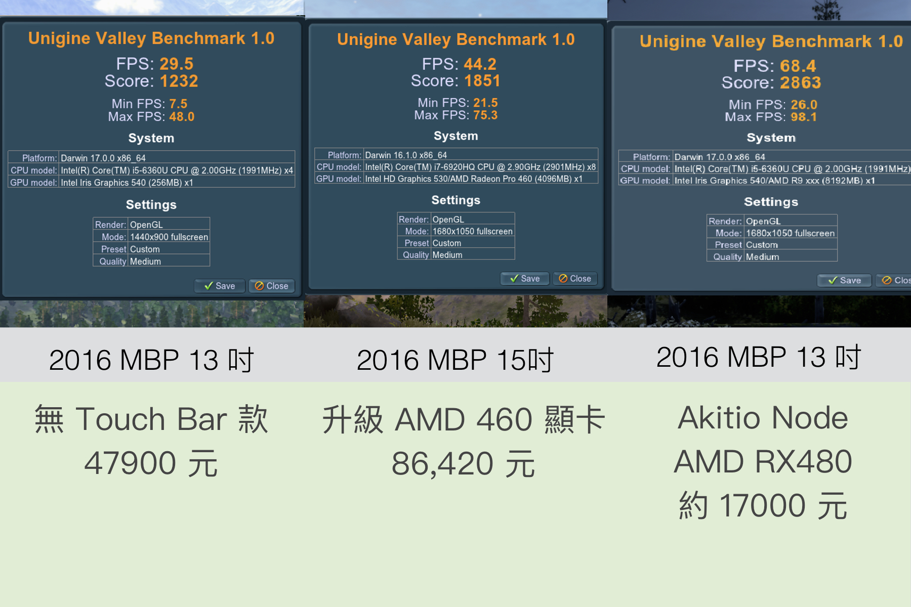 ▼ 如果是外接顯卡,效能馬上大飆升。FPS 來到了 70 左右,分數則是接近 3000。也就是說效能是原本的 200%,比 15 吋的 MBP 還高。