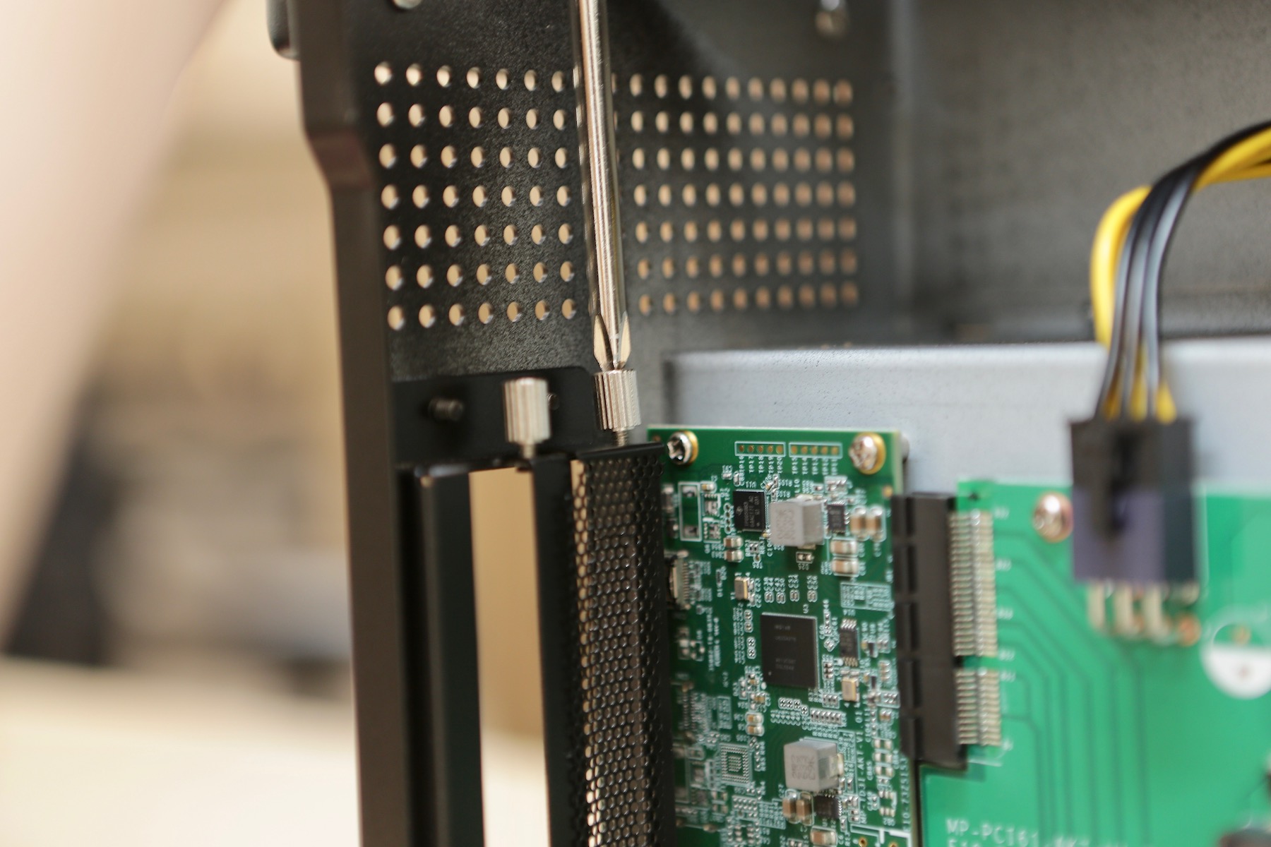 ▼ 接著我們把顯示卡對準 PCIE 插槽,小心的插上。然後把螺絲鎖回去,這樣就固定住了。
