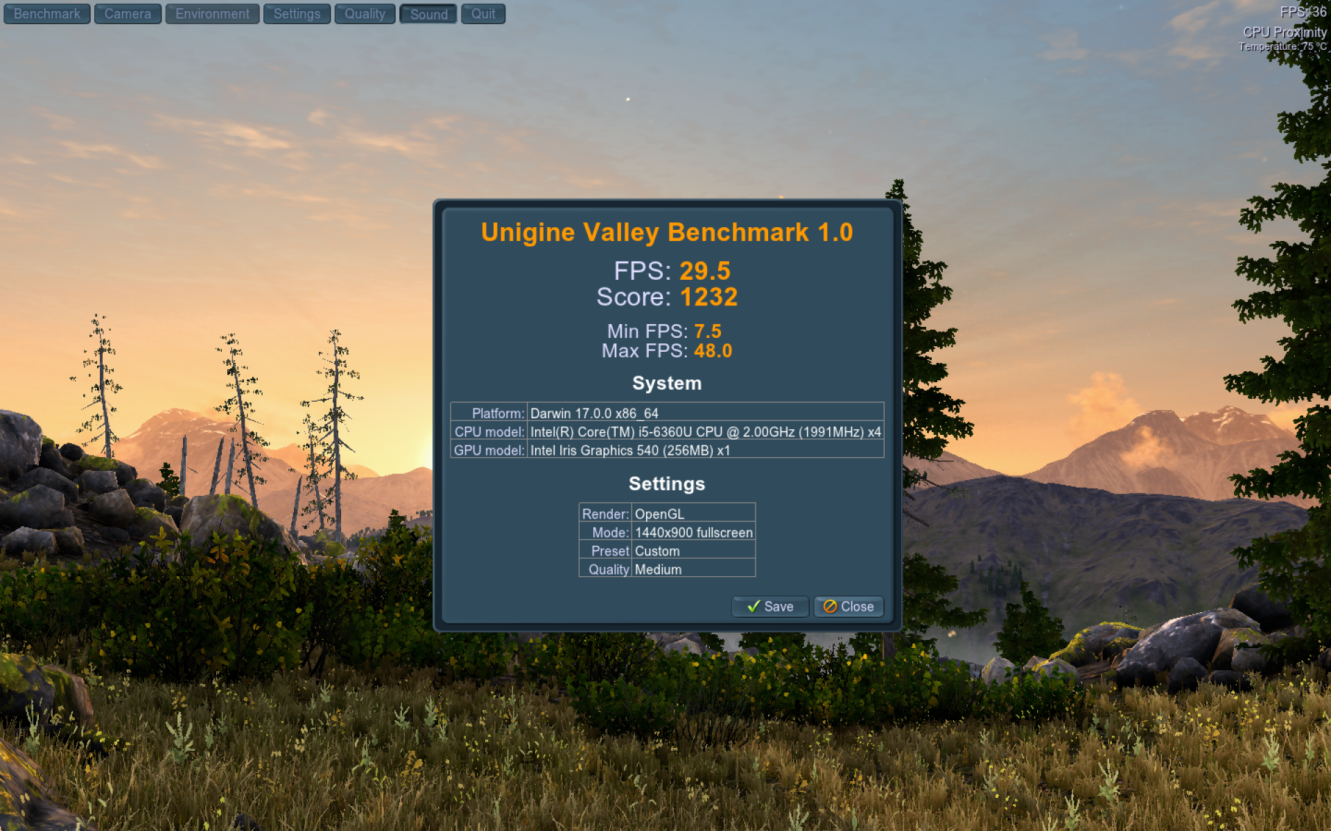 ▼ 那麼我們就來實際跑分看看,首先先用內建的顯卡測試,在 Valley 這個軟體的預設下,FPS 是 30 左右,分數來到了 1232。 (一樣的條件 15 吋的 MBP 的分數是 FPS 45,分數為 1800,大約是增加了 50% 的效能)