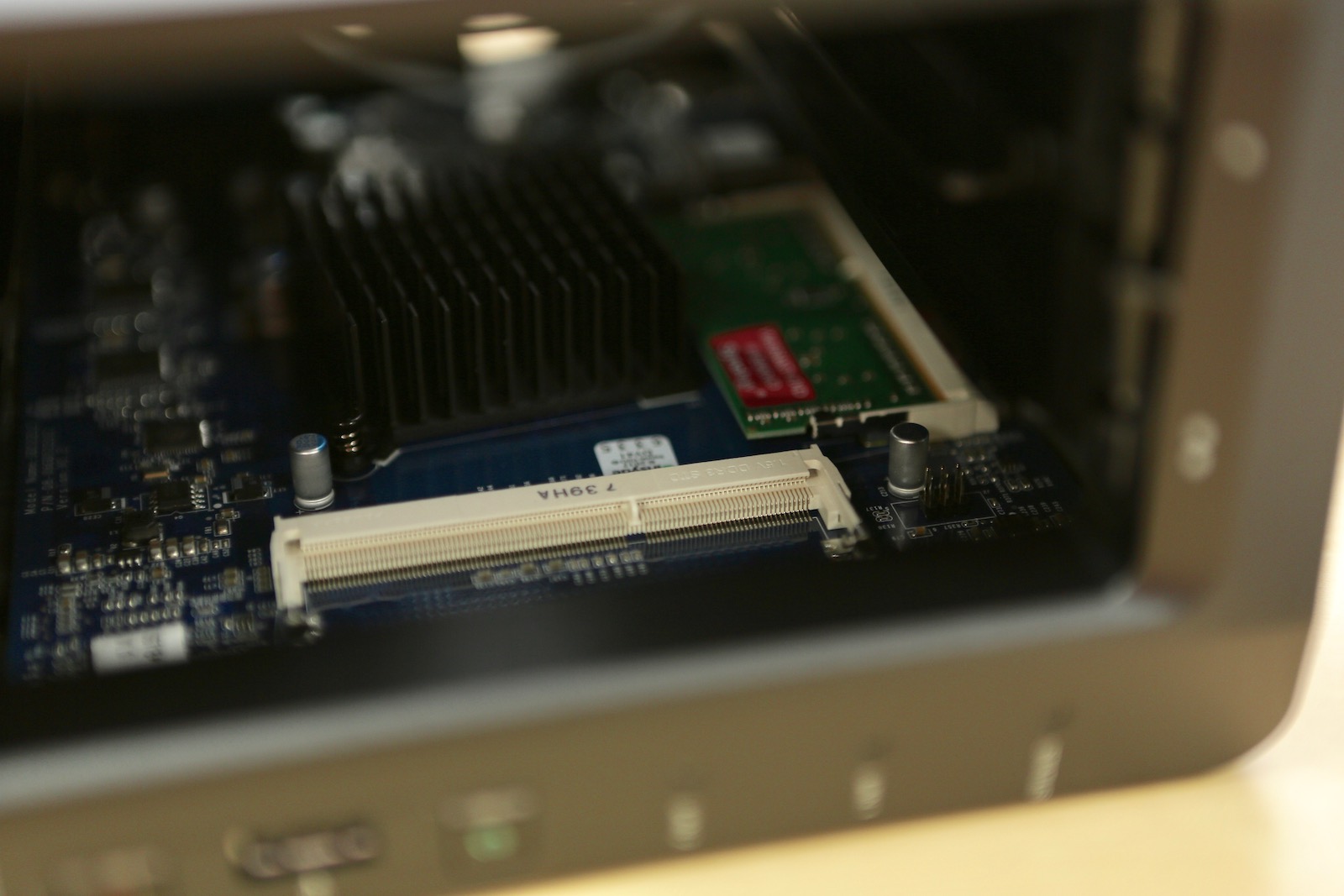 ▼ 抽出硬碟後,可以輕易的看到裡面的主機板配置,除了 CPU 比原本的 716+II 快了1.5倍之外,這次改版還有多一個空的記憶體插槽,可以之後自己加裝。這很重要,因為原本內建的記憶體為 2G,但只要自己再插一支 2G 或是更高的,有 4G Ram 以上就可以使用虛擬機功能,可以在 NAS 上面裝虛擬機 Windows 了。